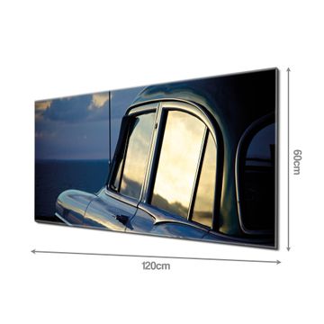 Material: 4mm Sicherheitsglas mit Metallrückwand Eigenschaften: beschreibbar, magnetisch, kratzfest Maße: 120x60x0,6cm, 10,80kg schwer Motiv Nummer 12499 Auto am Strand Zubehör: inklusive 4 Neodym-Magnete