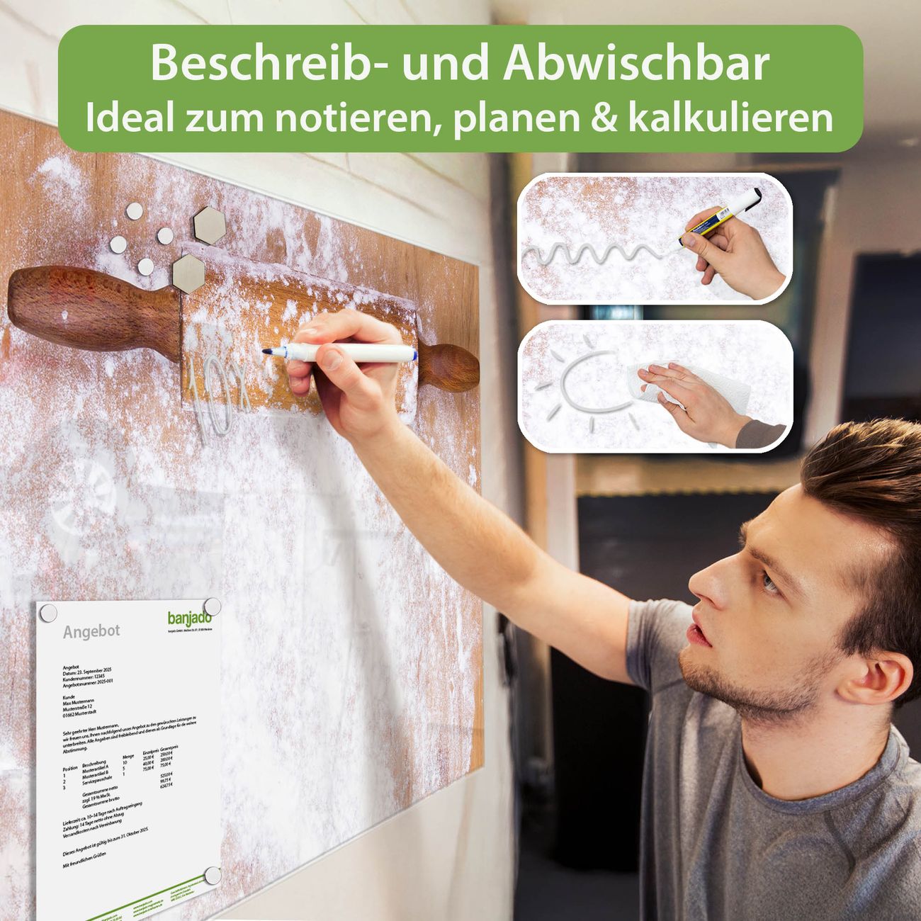 Auf der glatten Glasoberfläche lassen sich Termine, Rezepte oder Notizen ganz einfach mit Kreidestiften festhalten und rückstandslos entfernen. Starke Neodym-Magnete halten Ihre wichtigsten Erinnerungen sicher an Ort und Stelle. So entsteht Ihre ganz persönliche Ideenwand - jeden Tag neu.
