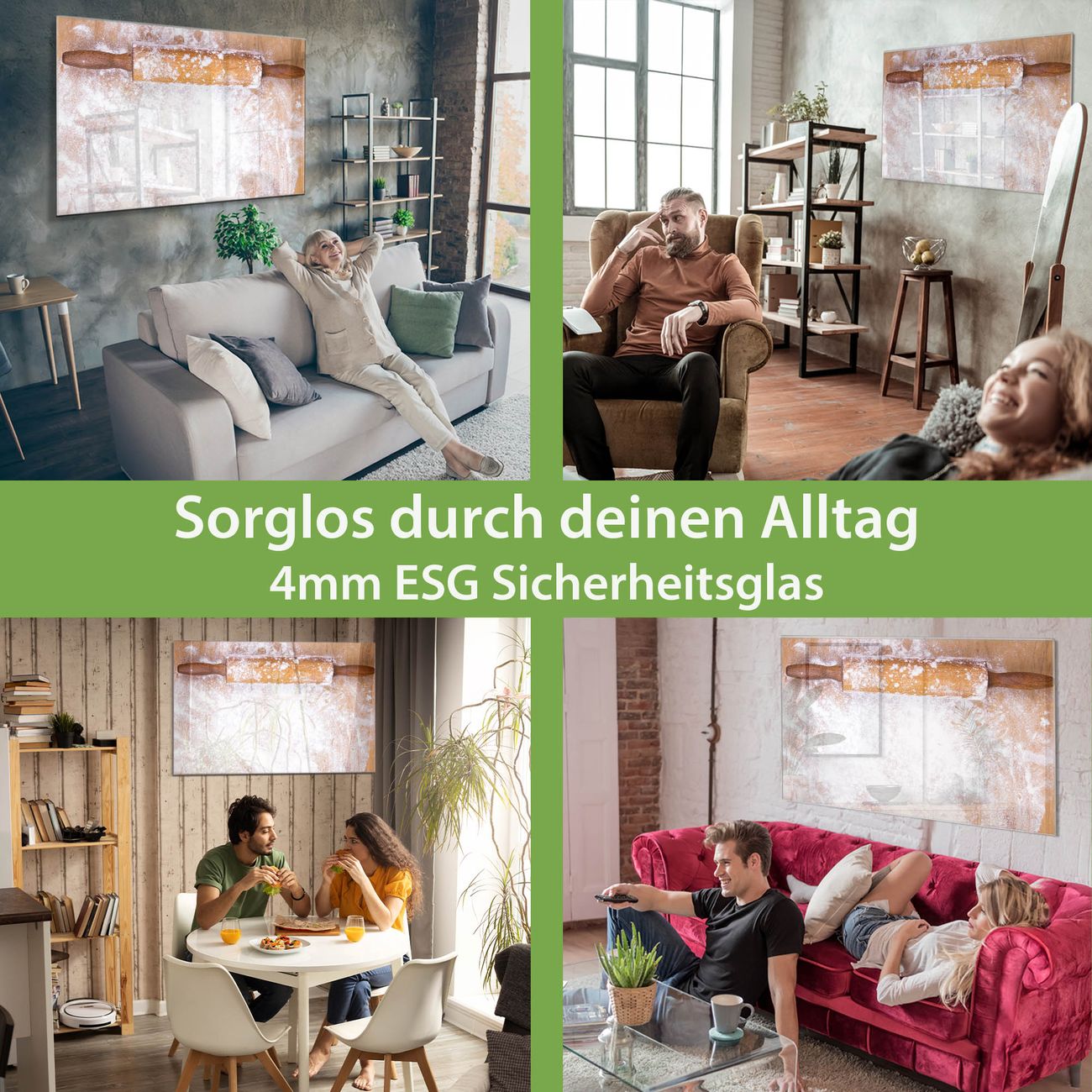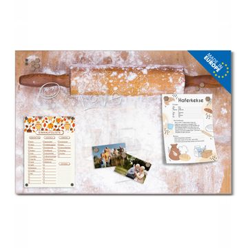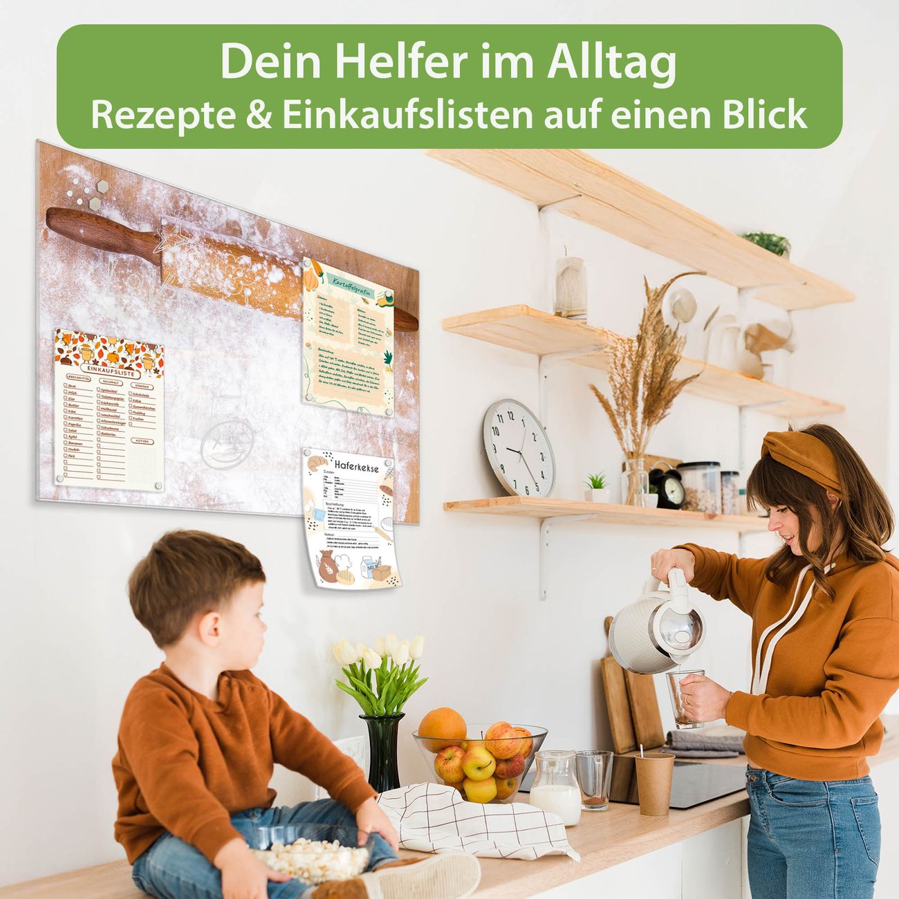 Material: 4mm Sicherheitsglas mit Metallrückwand Eigenschaften: beschreibbar, magnetisch, kratzfest Maße: 60x40x0,6cm, 3,6kg schwer Motiv Nummer 12531 Backen Zubehör: inklusive 4 Neodym-Magnete