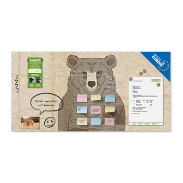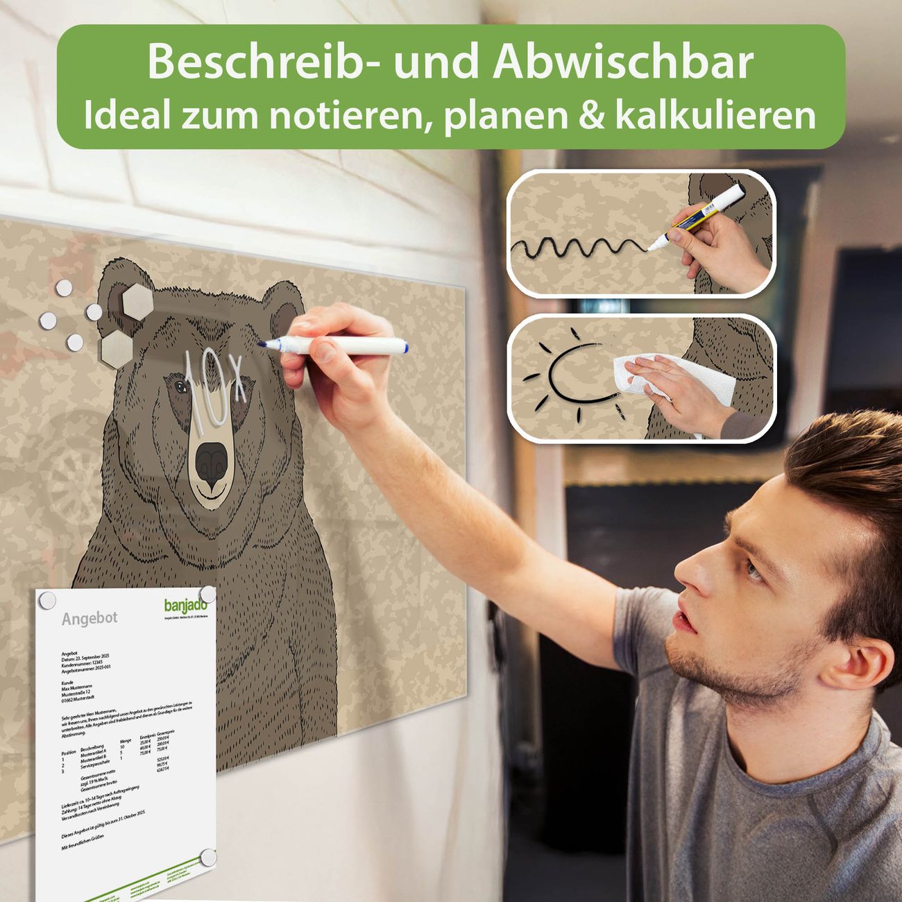 Material: 4mm Sicherheitsglas mit Metallrückwand Eigenschaften: beschreibbar, magnetisch, kratzfest Maße: 100x50x0,6cm, 7,50kg schwer Motiv Nummer 12102 Bär Ohne Brille Zubehör: inklusive 4 Neodym-Magnete