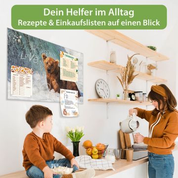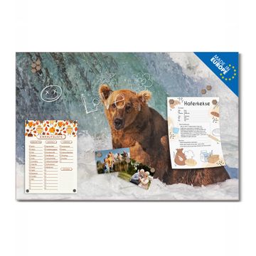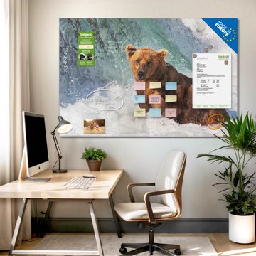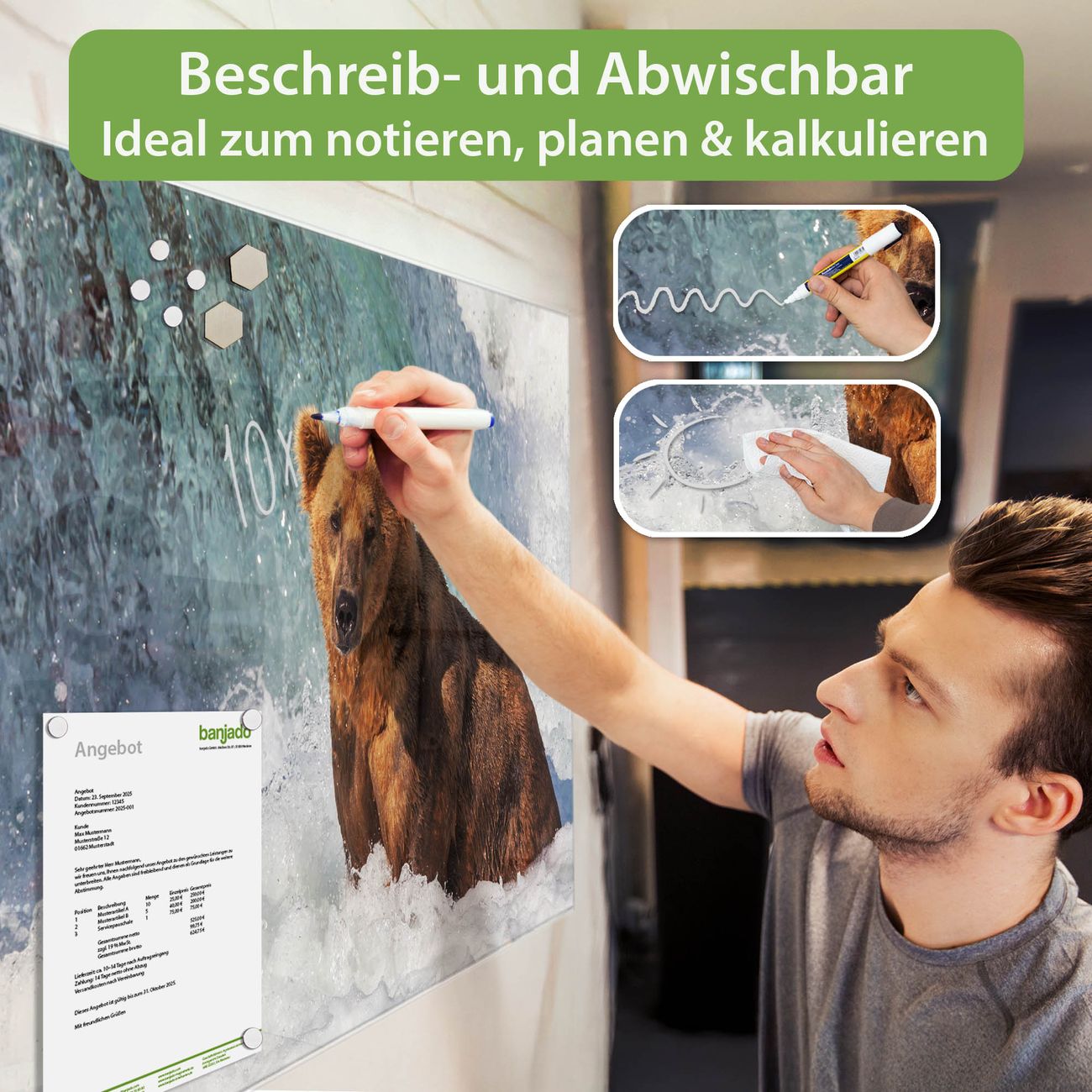 Material: 4mm Sicherheitsglas mit Metallrückwand Eigenschaften: beschreibbar, magnetisch, kratzfest Maße: 45x30x0,6cm, 2,03kg schwer Motiv Nummer 10498 Bär Im Wasser Zubehör: inklusive 4 Neodym-Magnete