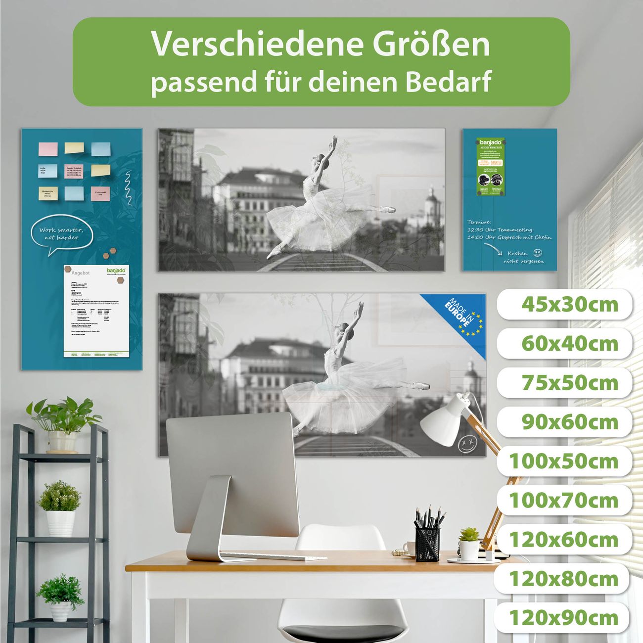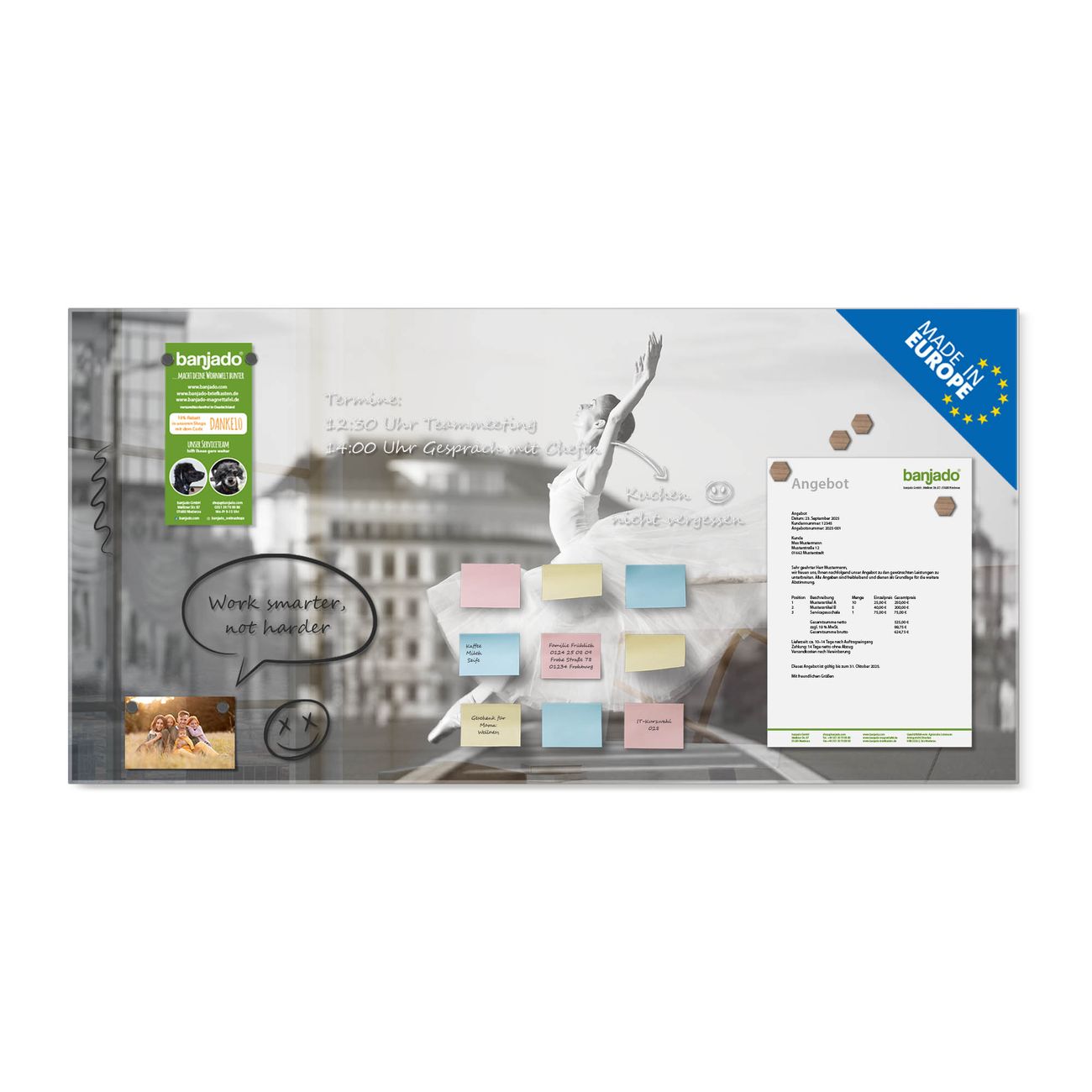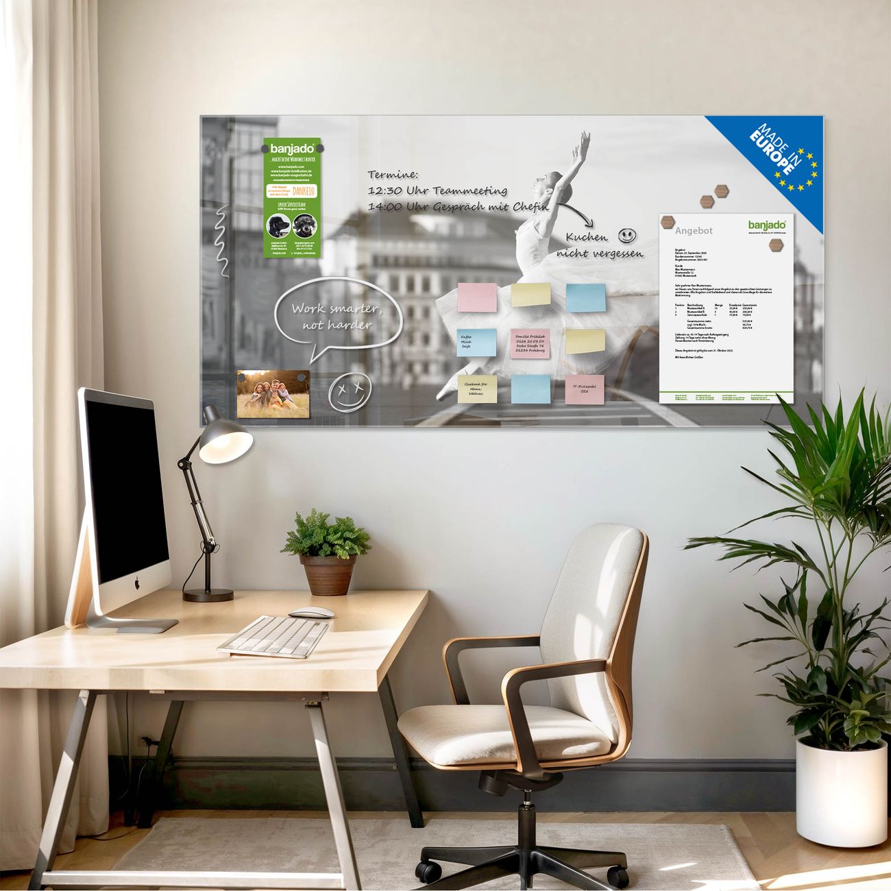 Jede Glas Magnettafel wird in unserer Werkstatt von Hand gefertigt und sorgfältig geprüft. So erhalten Sie ein echtes Qualitätsprodukt, das Funktion und Ästhetik perfekt vereint.?? Warum banjado?