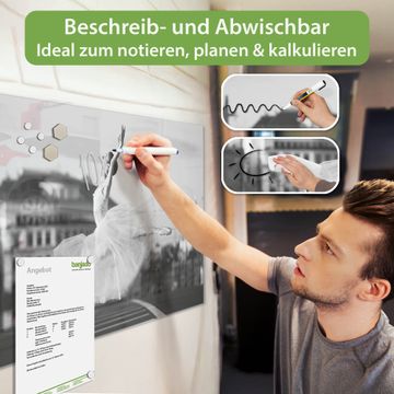 Auf der glatten Glasoberfläche lassen sich Termine, Rezepte oder Notizen ganz einfach mit Kreidestiften festhalten und rückstandslos entfernen. Starke Neodym-Magnete halten Ihre wichtigsten Erinnerungen sicher an Ort und Stelle. So entsteht Ihre ganz persönliche Ideenwand - jeden Tag neu.
