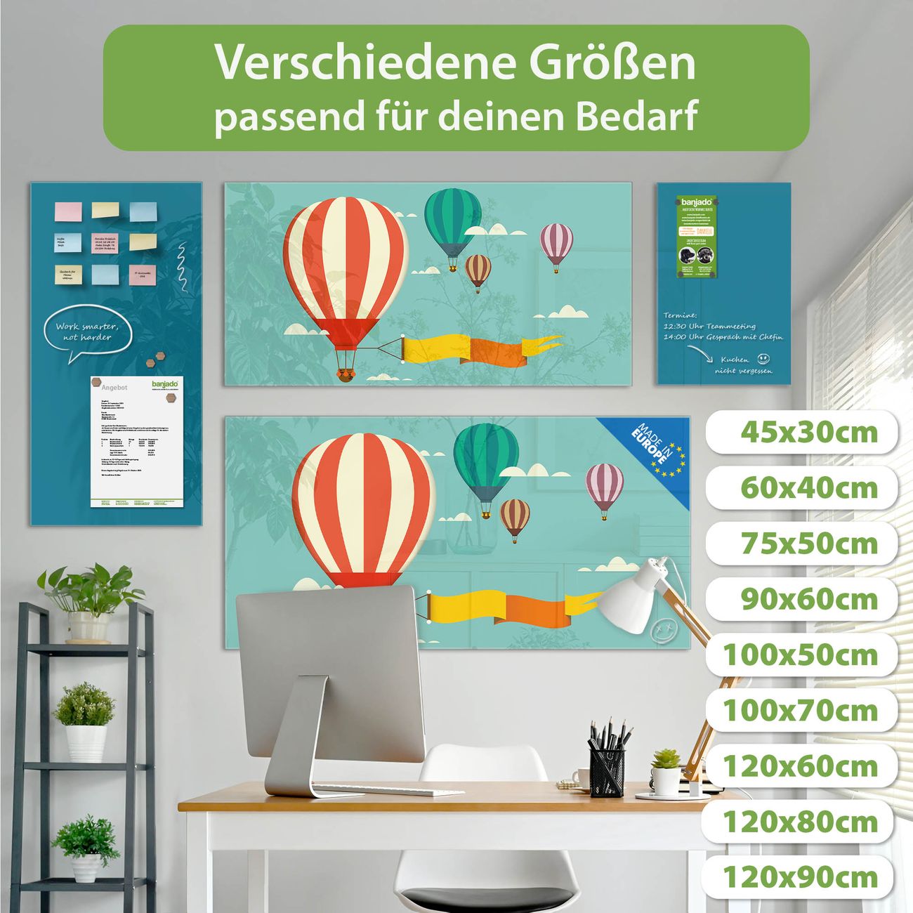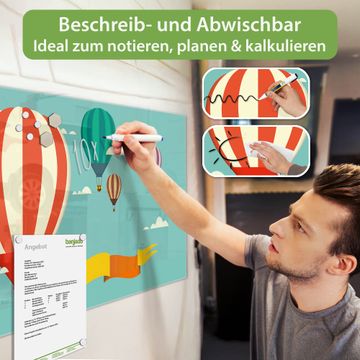 Material: 4mm Sicherheitsglas mit Metallrückwand Eigenschaften: beschreibbar, magnetisch, kratzfest Maße: 120x60x0,6cm, 10,80kg schwer Motiv Nummer 11362 Vier Ballons Zubehör: inklusive 4 Neodym-Magnete