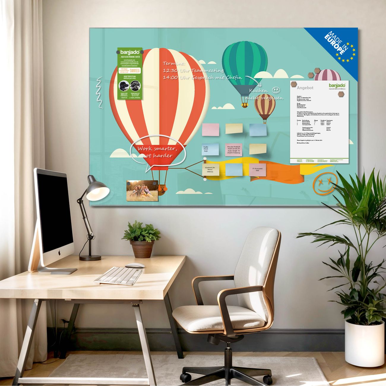 Jede Glas Magnettafel wird in unserer Werkstatt von Hand gefertigt und sorgfältig geprüft. So erhalten Sie ein echtes Qualitätsprodukt, das Funktion und Ästhetik perfekt vereint.?? Warum banjado?