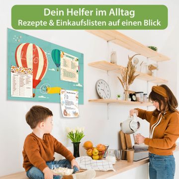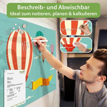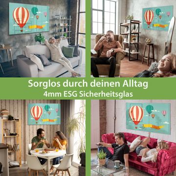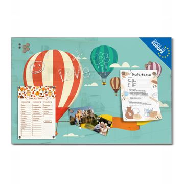 Material: 4mm Sicherheitsglas mit Metallrückwand Eigenschaften: beschreibbar, magnetisch, kratzfest Maße: 75x50x0,6cm, 5,63kg schwer Motiv Nummer 11362 Vier Ballons Zubehör: inklusive 4 Neodym-Magnete