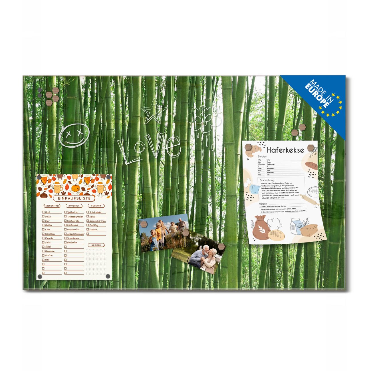 Ein Stück Design, das Ihren Alltag organisiert. Schreiben, heften, inspirieren - alles an einem Ort. Qualität, die man spürt. Montage leicht gemacht. Handwerk mit Herz - veredelt in Sachsen. Einzigartiges Design mit Motiv Motiv Bambus Beschreibbare Glasoberfläche, leicht zu reinigen Starke Magnetkraft durch Stahlrückwand Inklusive 4 Neodym-Magneten Flexible Montageoptionen Handveredelt in Sachsen - Qualität, die bleibt