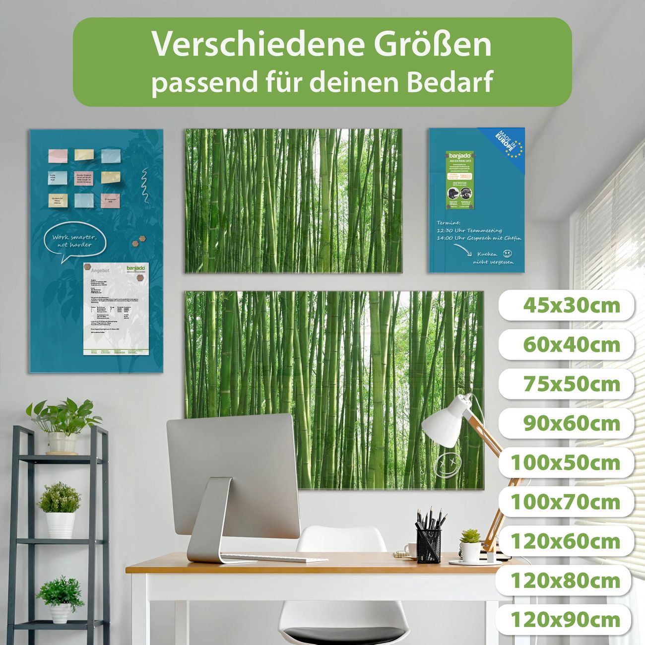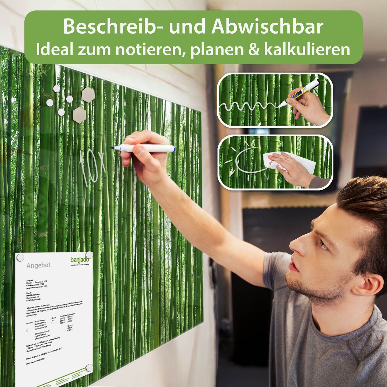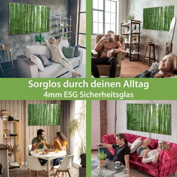 Material: 4mm Sicherheitsglas mit Metallrückwand Eigenschaften: beschreibbar, magnetisch, kratzfest Maße: 75x50x0,6cm, 5,63kg schwer Motiv Nummer 10003 Bambus Zubehör: inklusive 4 Neodym-Magnete