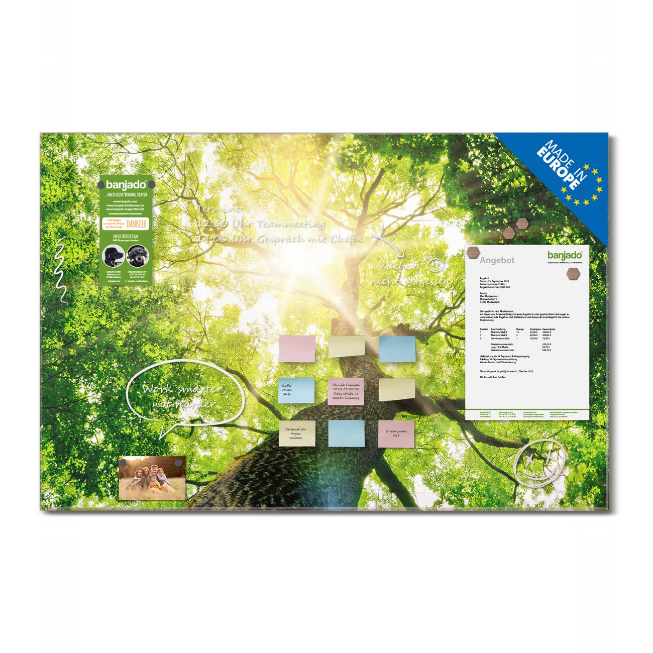 Material: 4mm Sicherheitsglas mit Metallrückwand Eigenschaften: beschreibbar, magnetisch, kratzfest Maße: 120x80x0,6cm, 14,40kg schwer Motiv Nummer 10443 Baumkrone Zubehör: inklusive 4 Neodym-Magnete