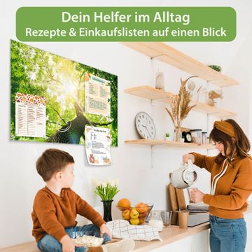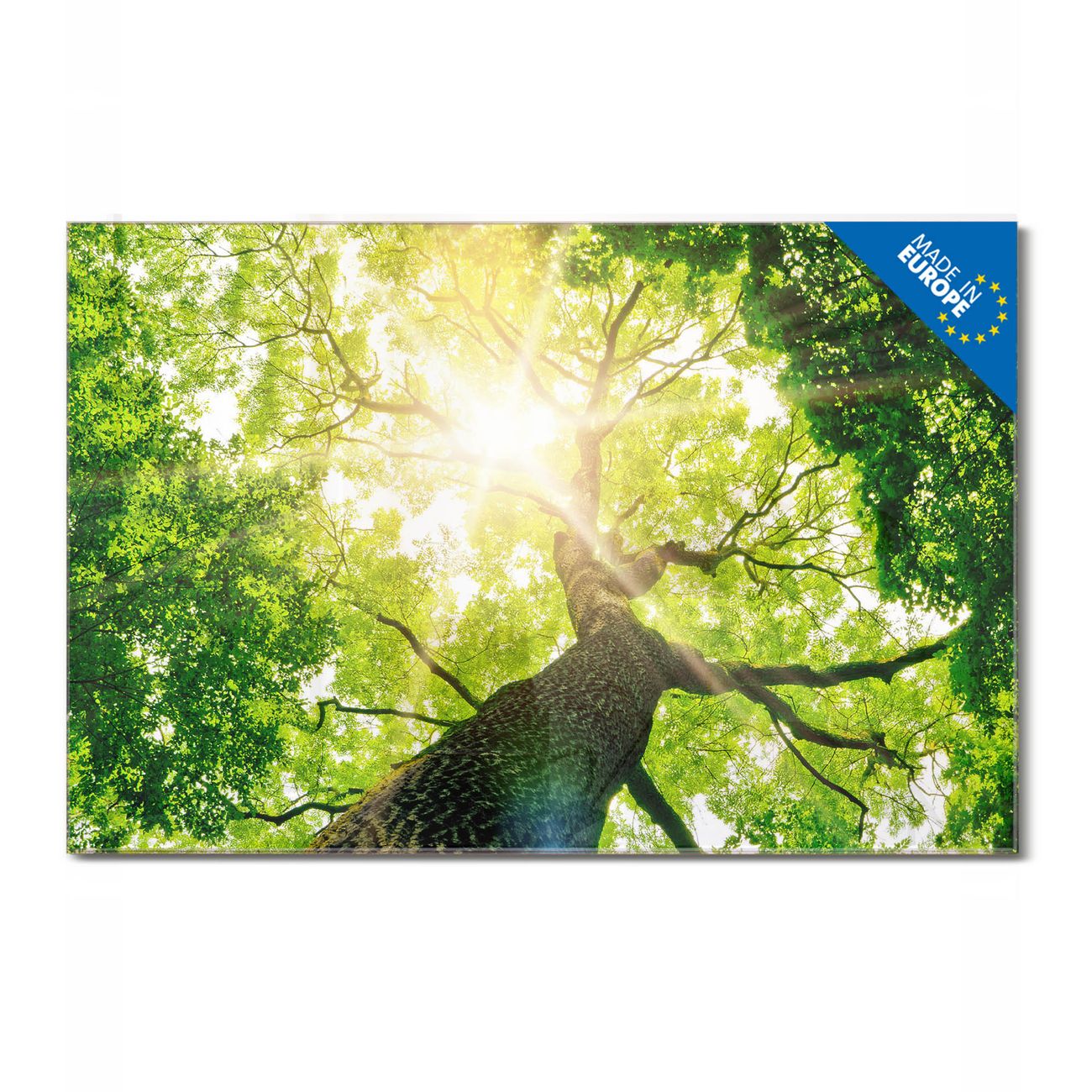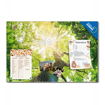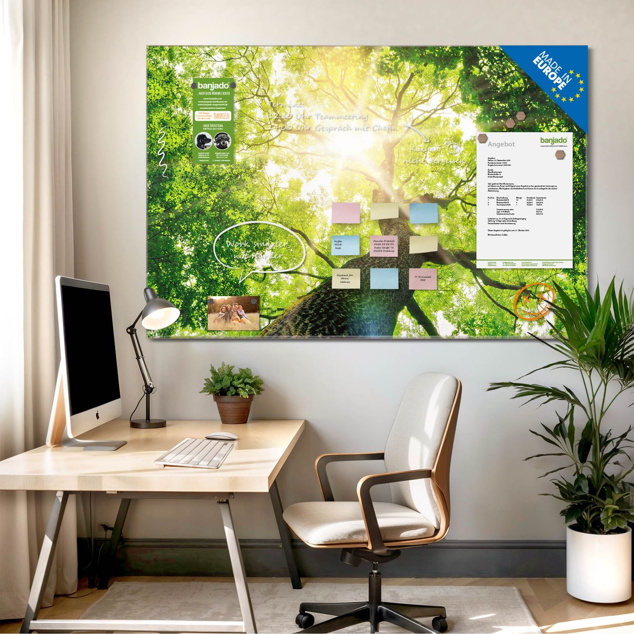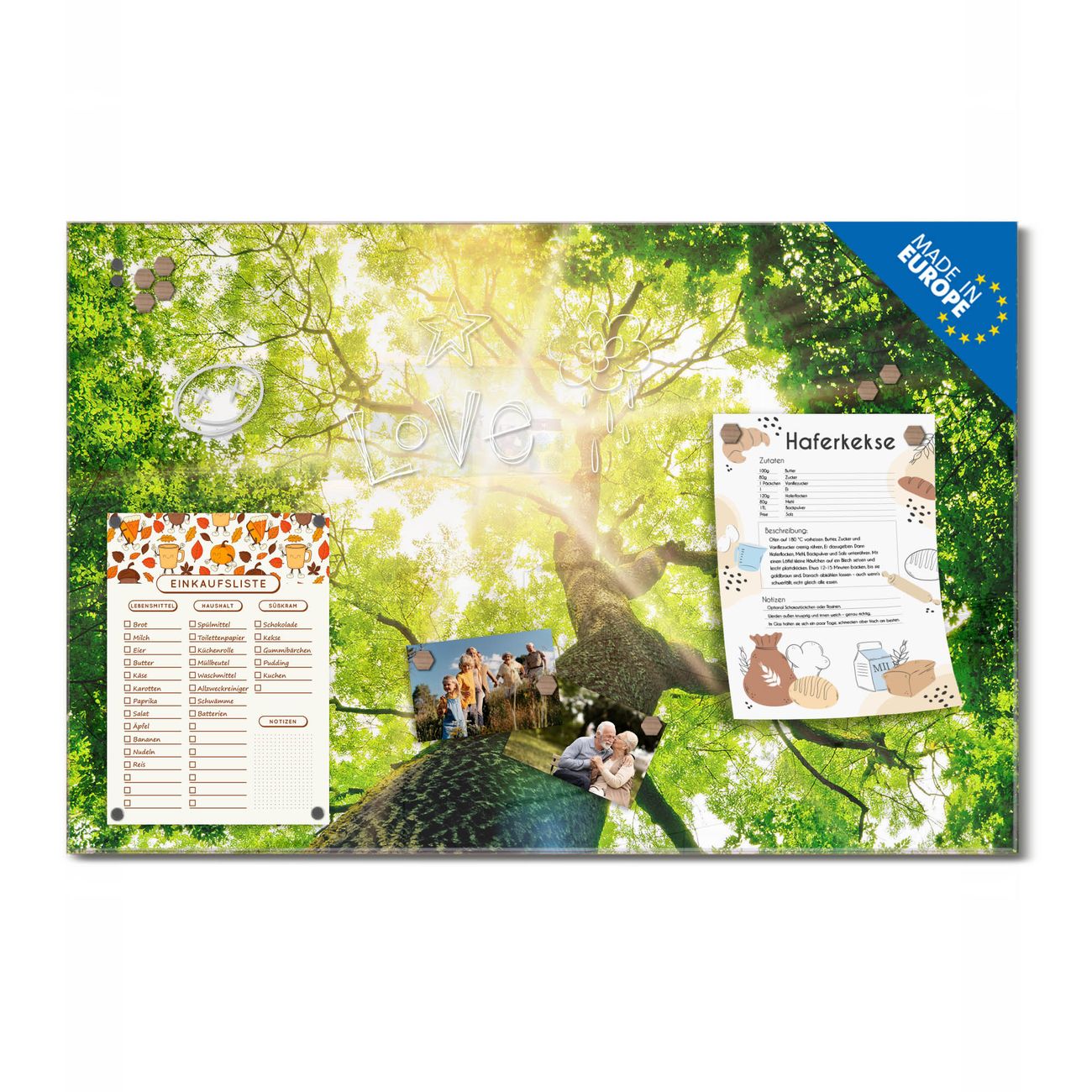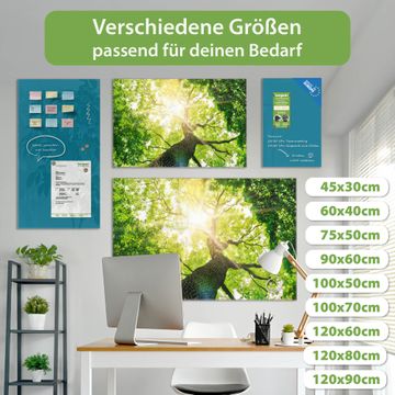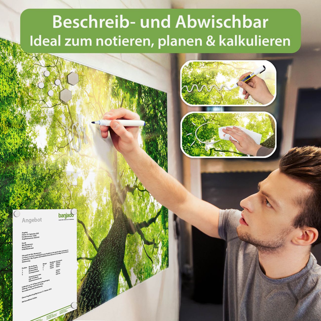 Material: 4mm Sicherheitsglas mit Metallrückwand Eigenschaften: beschreibbar, magnetisch, kratzfest Maße: 45x30x0,6cm, 2,03kg schwer Motiv Nummer 10443 Baumkrone Zubehör: inklusive 4 Neodym-Magnete
