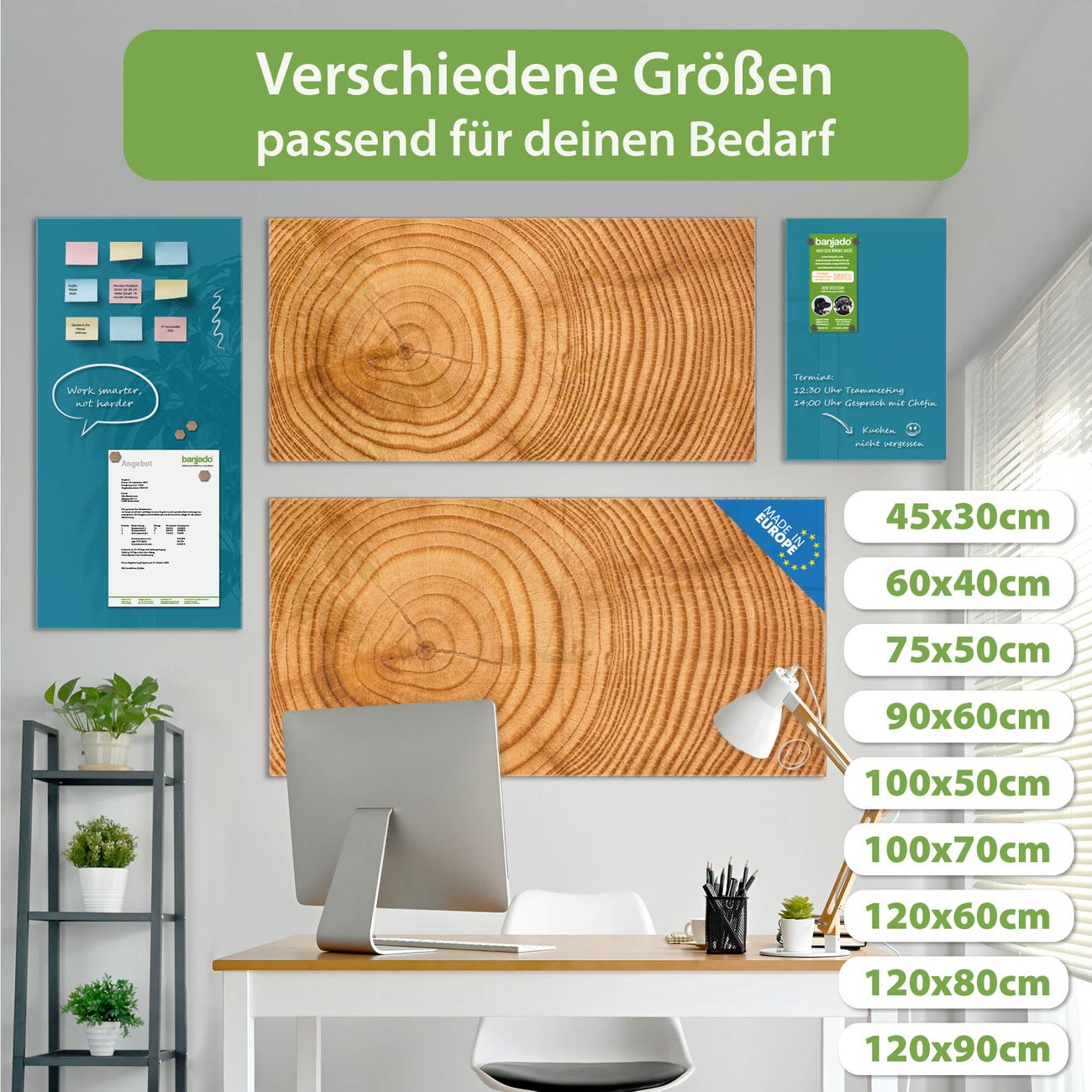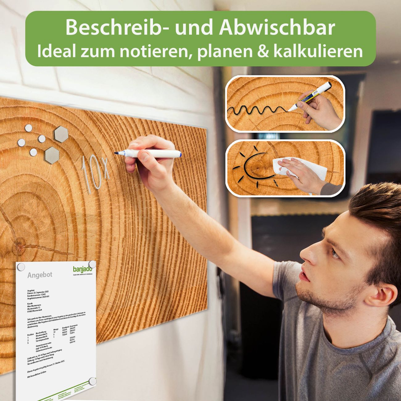 Material: 4mm Sicherheitsglas mit Metallrückwand Eigenschaften: beschreibbar, magnetisch, kratzfest Maße: 100x50x0,6cm, 7,50kg schwer Motiv Nummer 10289 Baumstamm Zubehör: inklusive 4 Neodym-Magnete
