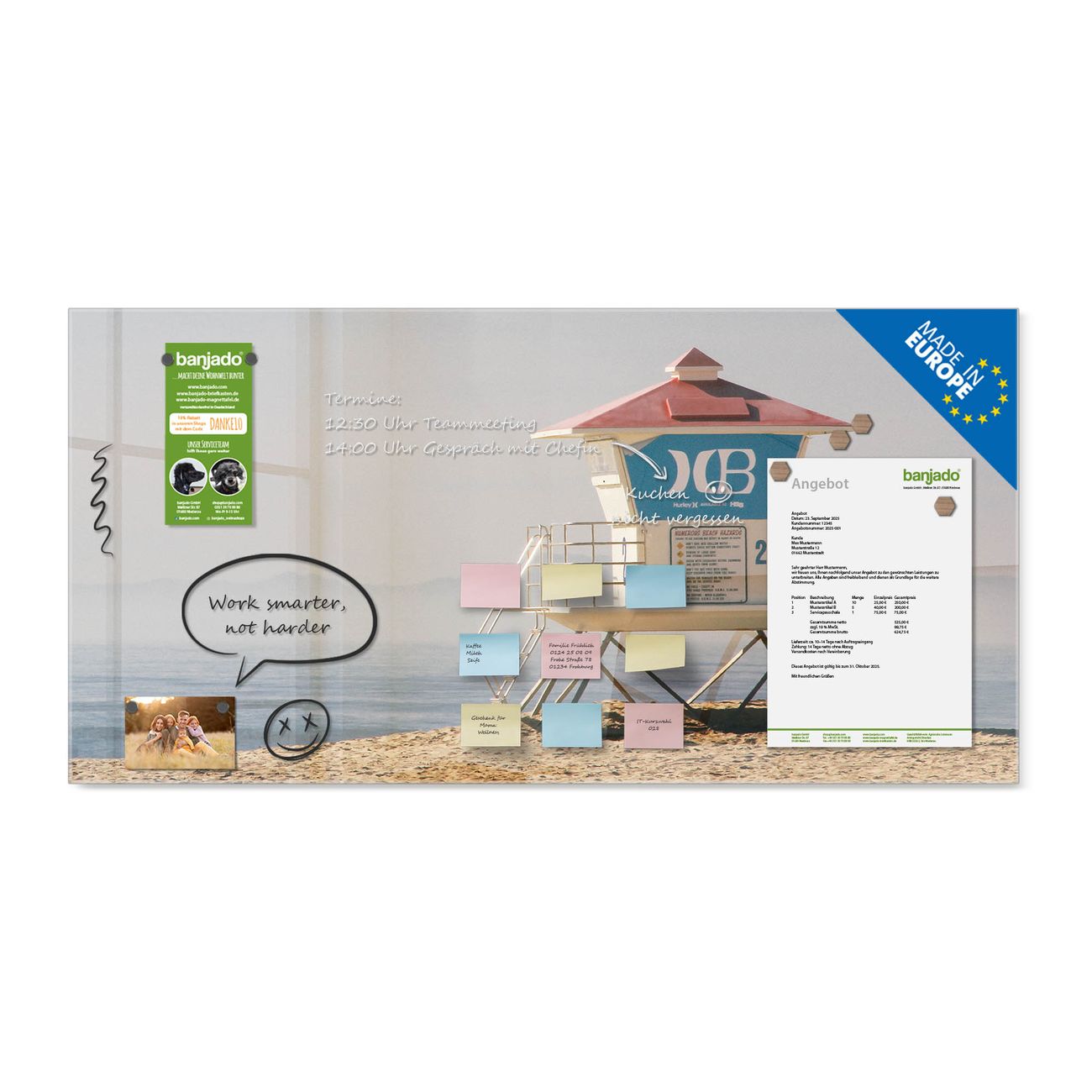 Die banjado Glas Magnettafel mit dem Motiv Motiv Beach Section verbindet Funktionalität mit Stil. Sie ersetzt das Zettelchaos durch klare Strukturen und bringt dabei eine warme, natürliche Atmosphäre in Ihr Zuhause. Ob im Büro, in der Küche oder im Eingangsbereich - dieses Design-Board zieht Blicke an und sorgt für Ordnung mit Charakter.