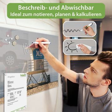 Material: 4mm Sicherheitsglas mit Metallrückwand Eigenschaften: beschreibbar, magnetisch, kratzfest Maße: 120x60x0,6cm, 10,80kg schwer Motiv Nummer 11913 Beach Section Zubehör: inklusive 4 Neodym-Magnete