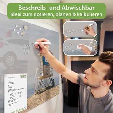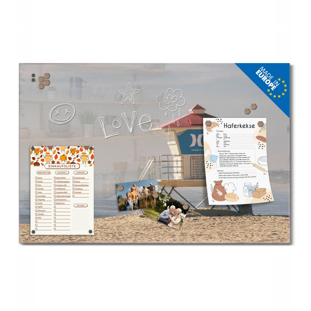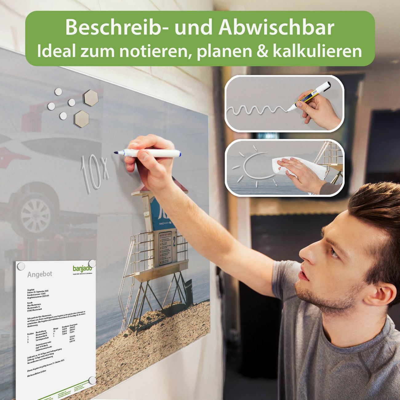 Material: 4mm Sicherheitsglas mit Metallrückwand Eigenschaften: beschreibbar, magnetisch, kratzfest Maße: 45x30x0,6cm, 2,03kg schwer Motiv Nummer 11913 Beach Section Zubehör: inklusive 4 Neodym-Magnete