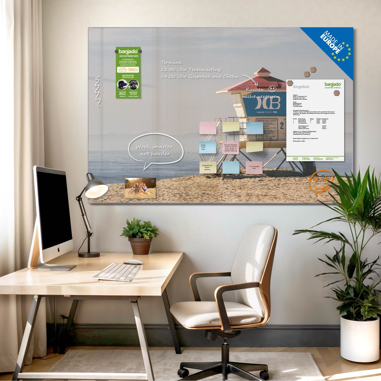 Die banjado Glas Magnettafel mit dem Motiv Motiv Beach Section verbindet Funktionalität mit Stil. Sie ersetzt das Zettelchaos durch klare Strukturen und bringt dabei eine warme, natürliche Atmosphäre in Ihr Zuhause. Ob im Büro, in der Küche oder im Eingangsbereich - dieses Design-Board zieht Blicke an und sorgt für Ordnung mit Charakter.