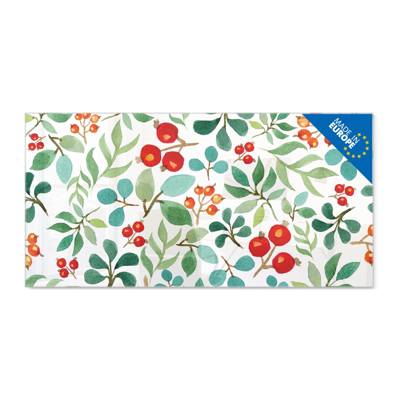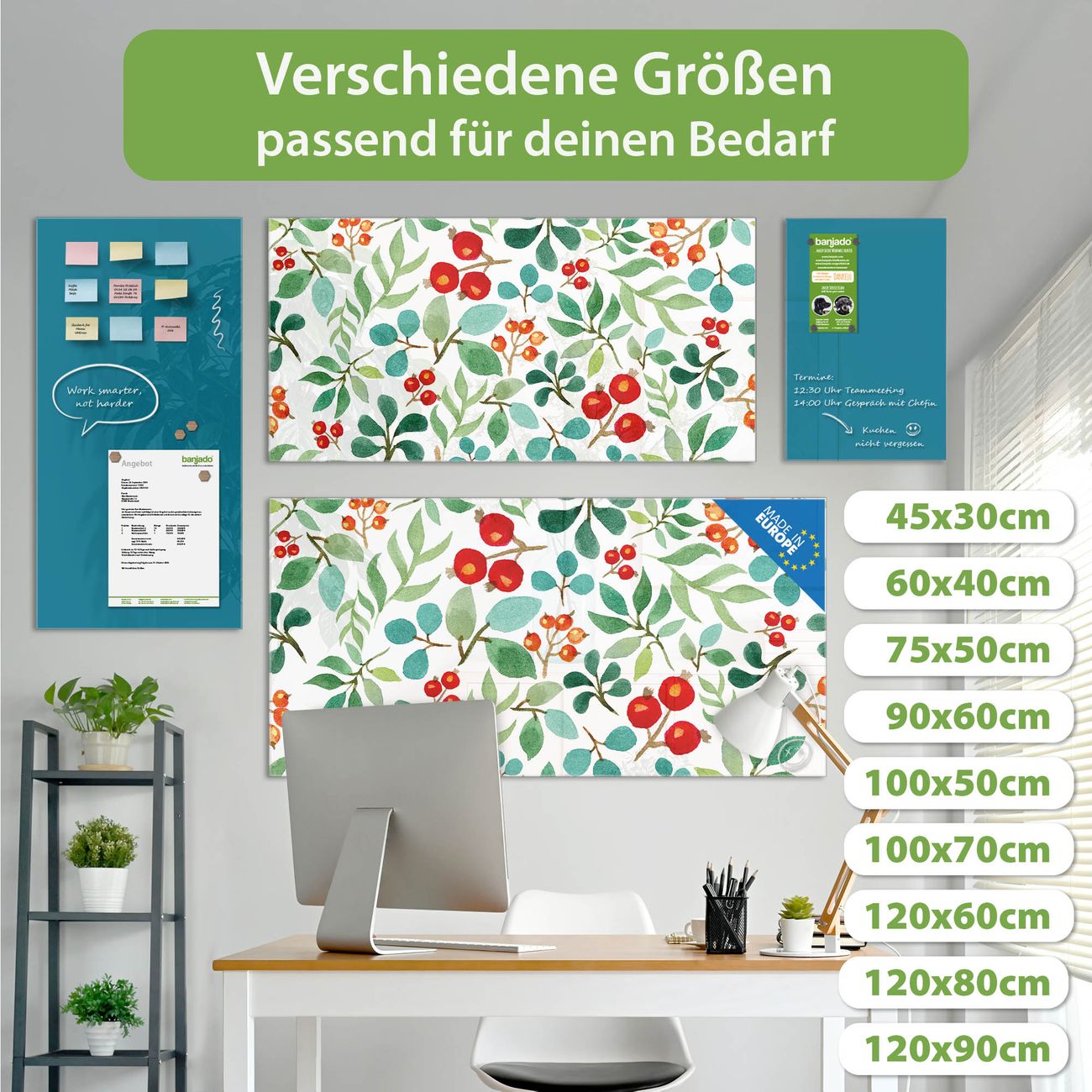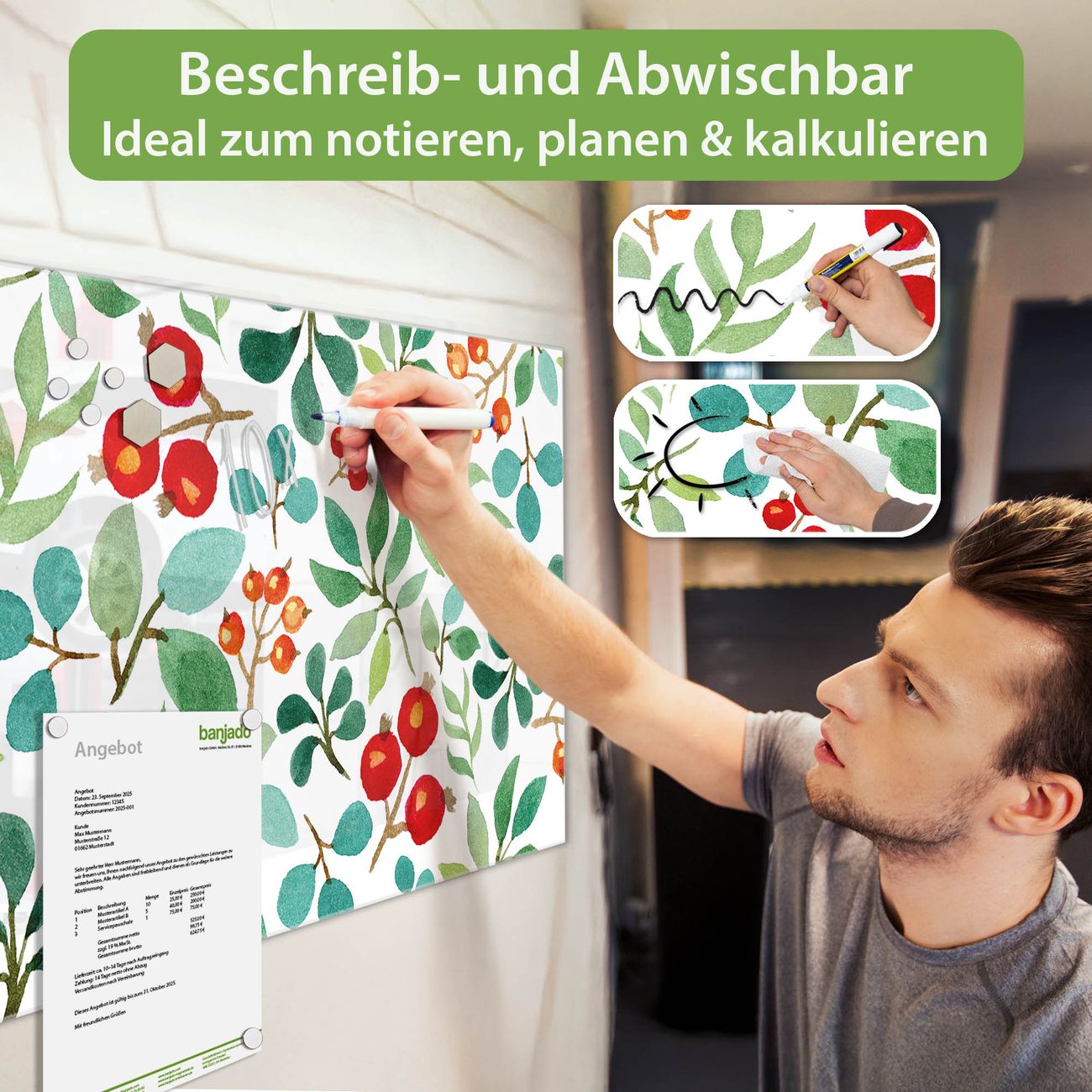 Material: 4mm Sicherheitsglas mit Metallrückwand Eigenschaften: beschreibbar, magnetisch, kratzfest Maße: 100x50x0,6cm, 7,50kg schwer Motiv Nummer 12605 Beeren und Blätter Zubehör: inklusive 4 Neodym-Magnete