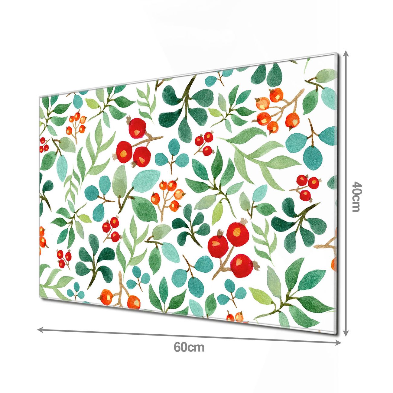 Material: 4mm Sicherheitsglas mit Metallrückwand Eigenschaften: beschreibbar, magnetisch, kratzfest Maße: 60x40x0,6cm, 3,6kg schwer Motiv Nummer 12605 Beeren und Blätter Zubehör: inklusive 4 Neodym-Magnete