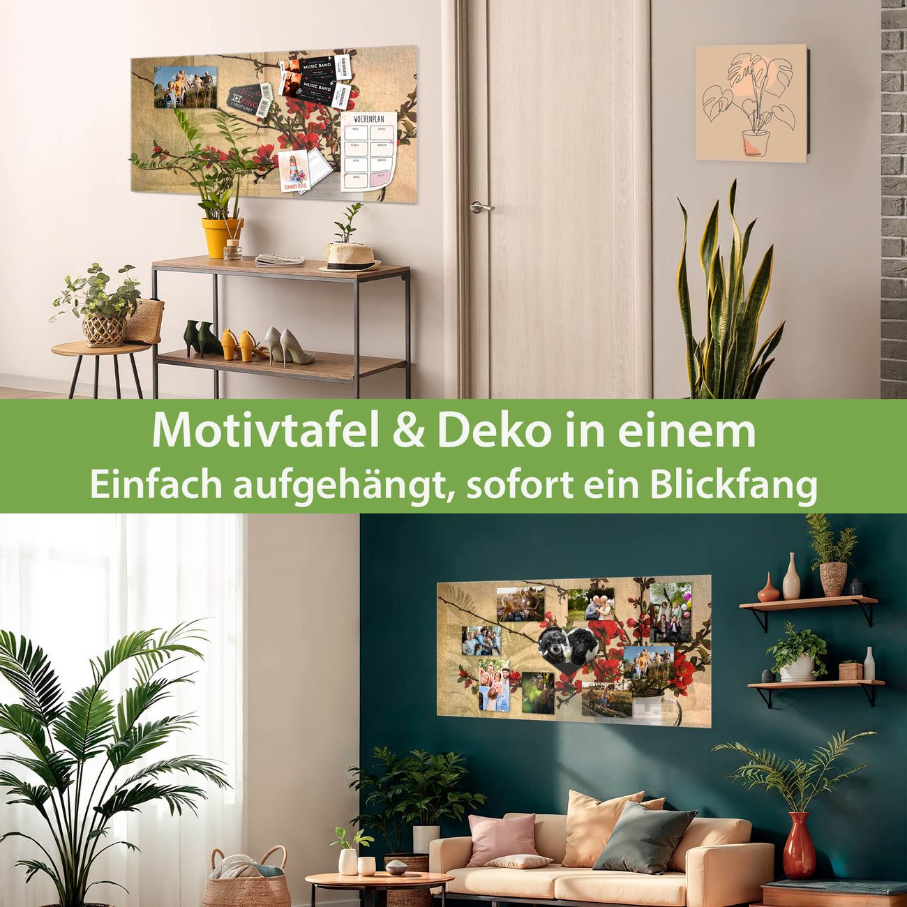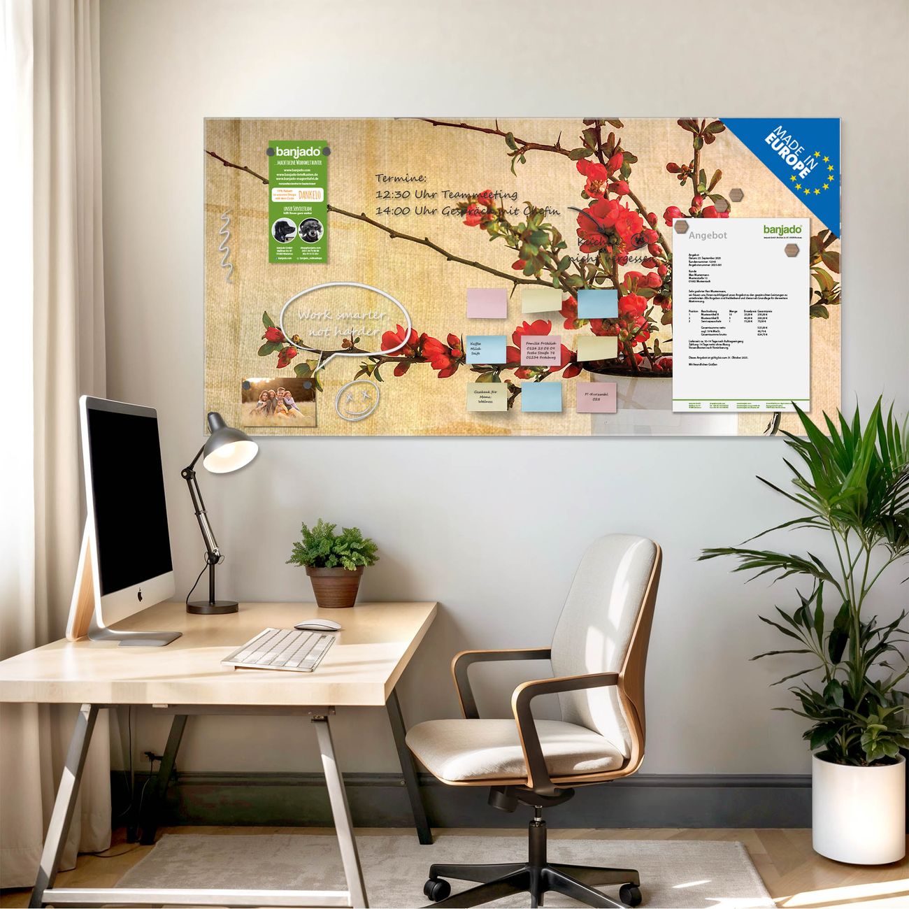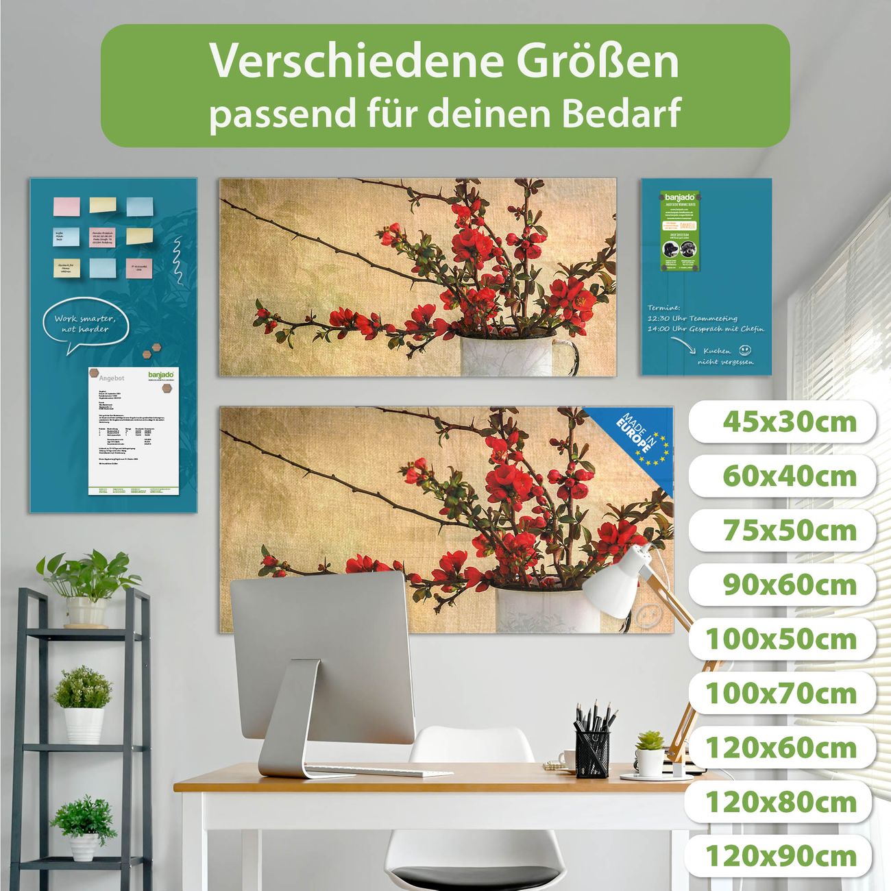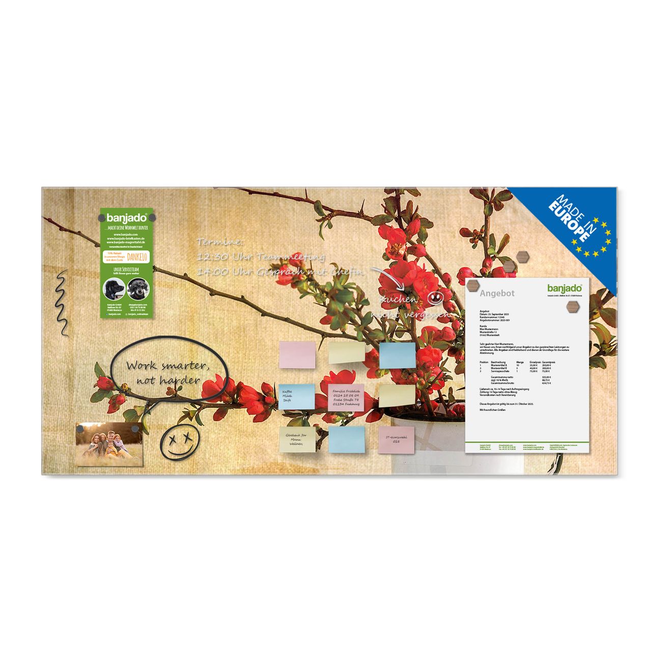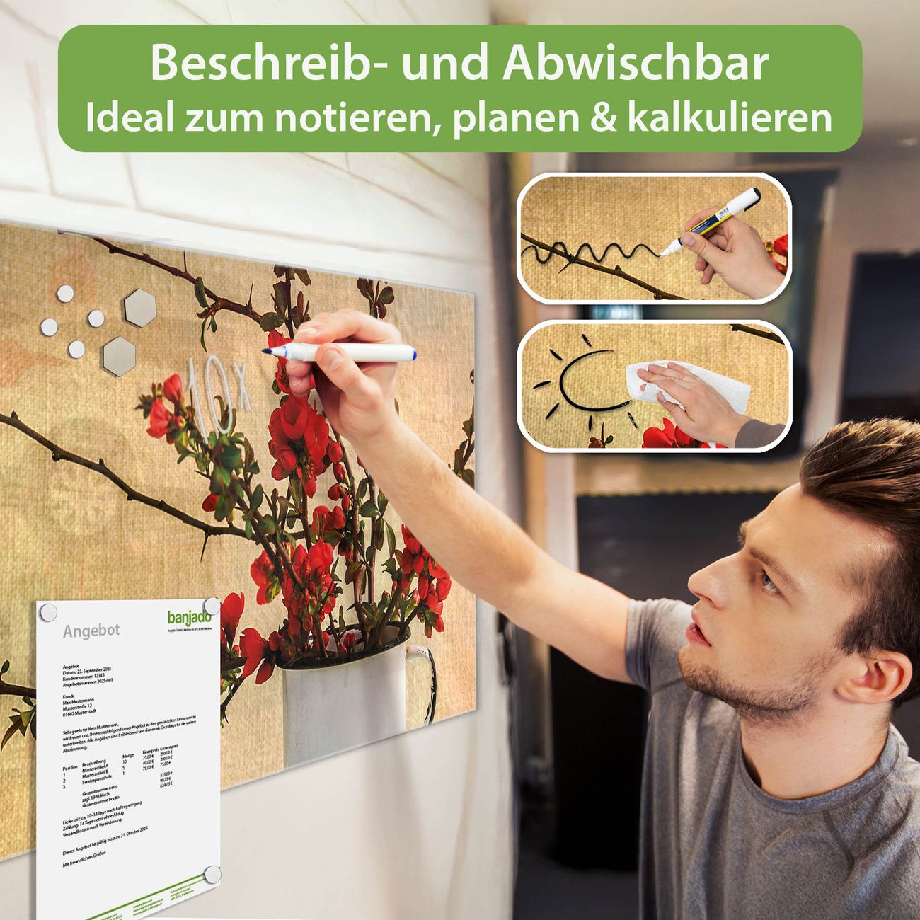 Material: 4mm Sicherheitsglas mit Metallrückwand Eigenschaften: beschreibbar, magnetisch, kratzfest Maße: 100x50x0,6cm, 7,50kg schwer Motiv Nummer 12348 Berberitzen Zubehör: inklusive 4 Neodym-Magnete