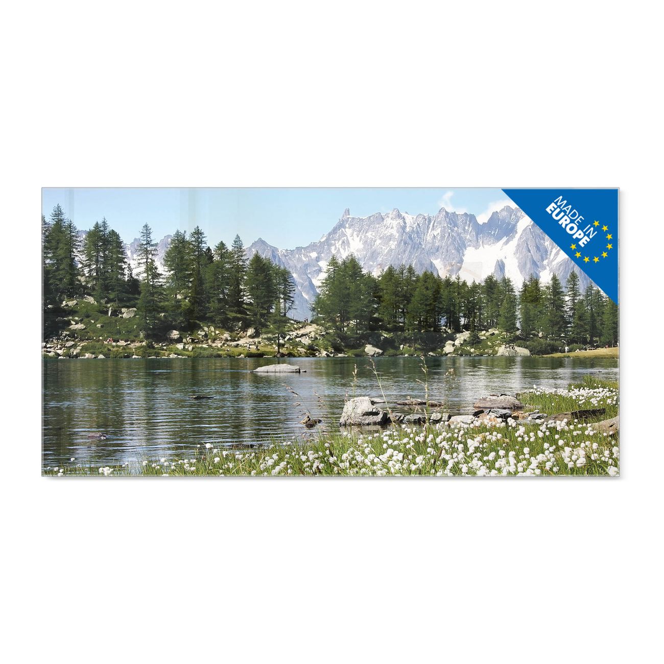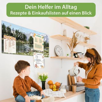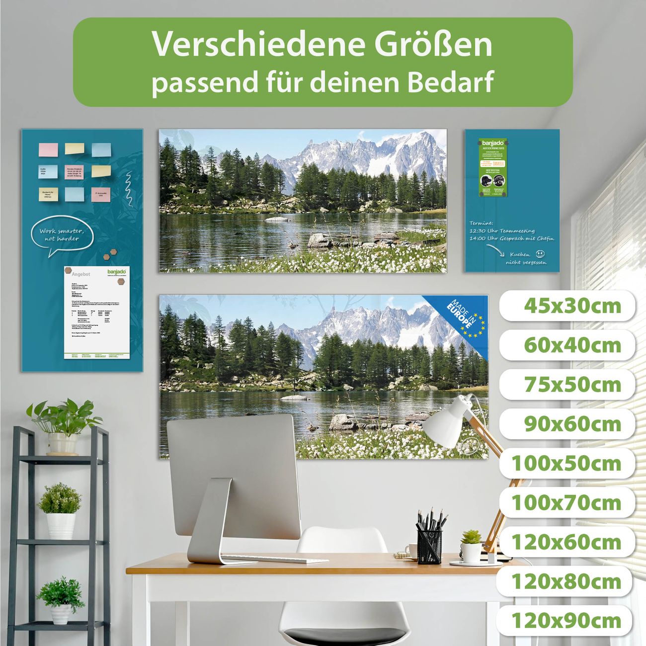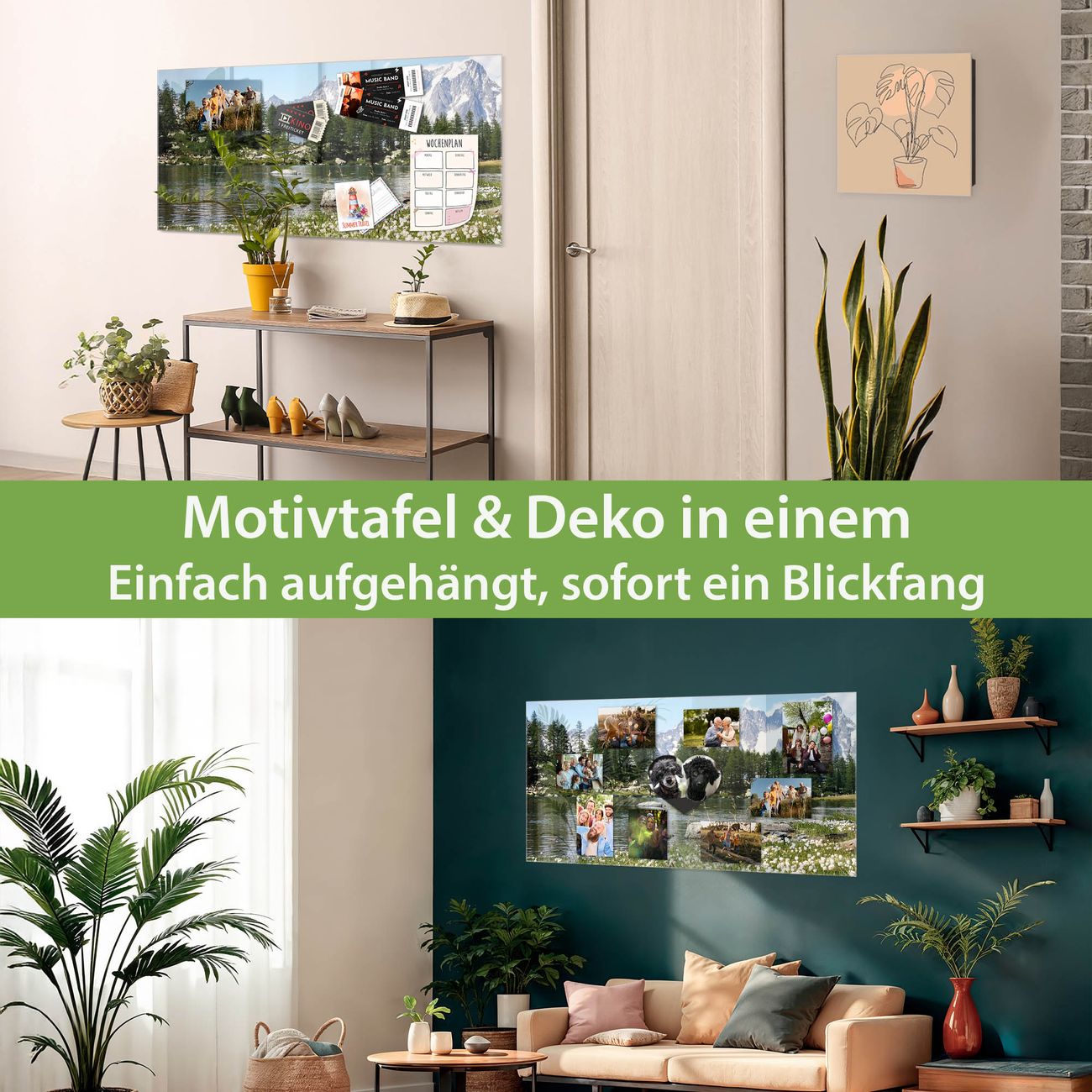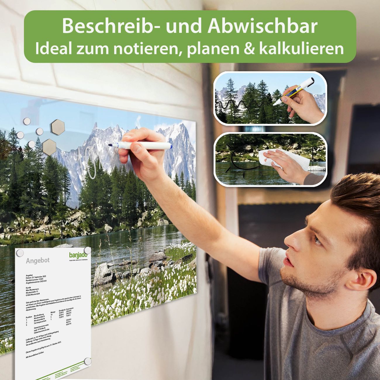 Material: 4mm Sicherheitsglas mit Metallrückwand Eigenschaften: beschreibbar, magnetisch, kratzfest Maße: 100x50x0,6cm, 7,50kg schwer Motiv Nummer 12296 Bergidylle Zubehör: inklusive 4 Neodym-Magnete