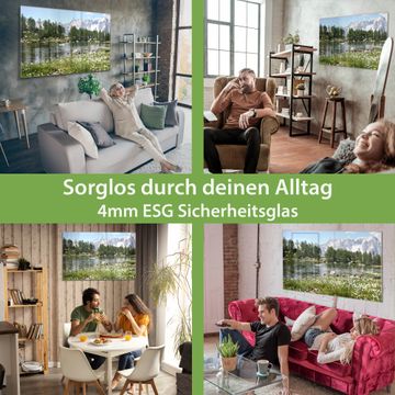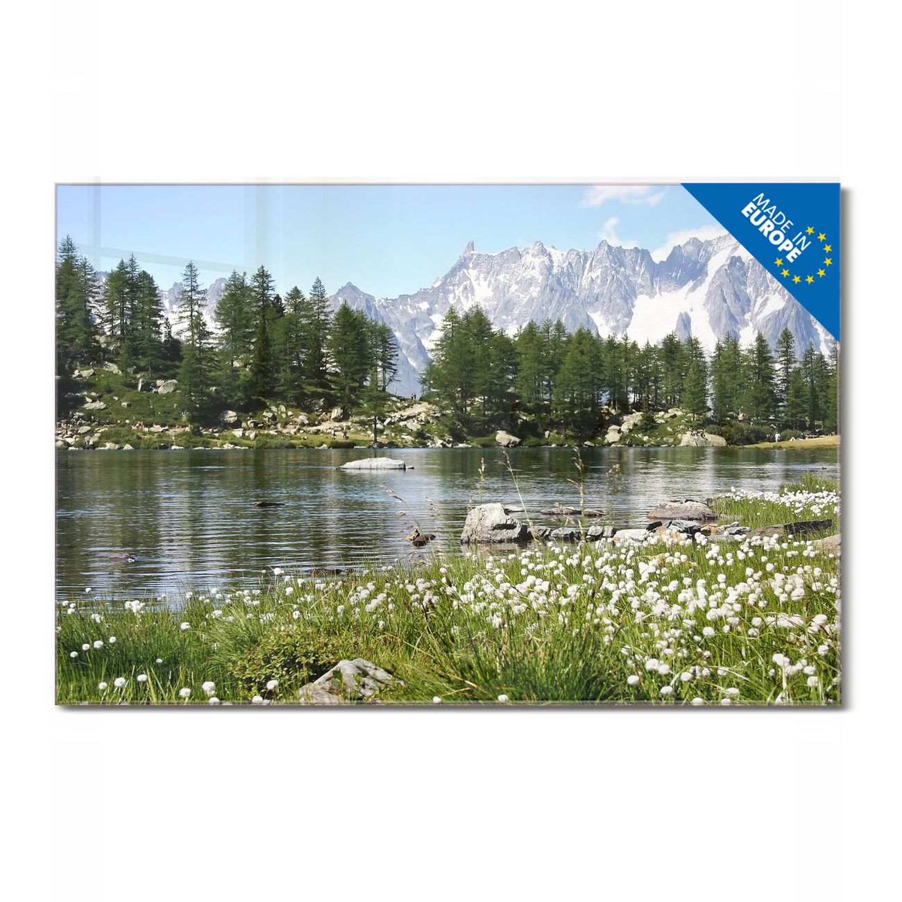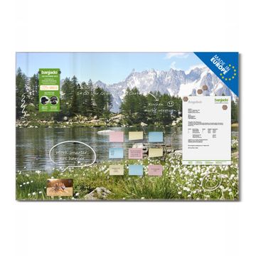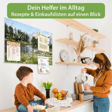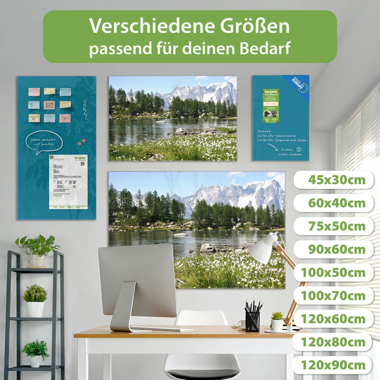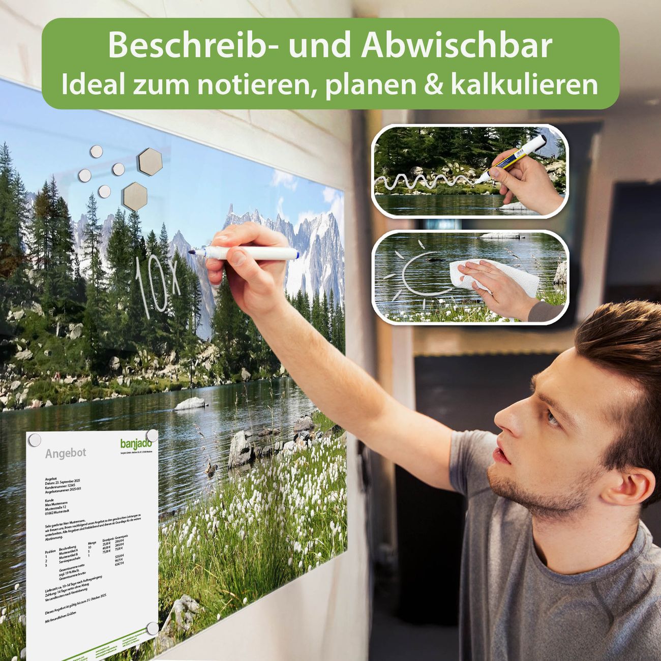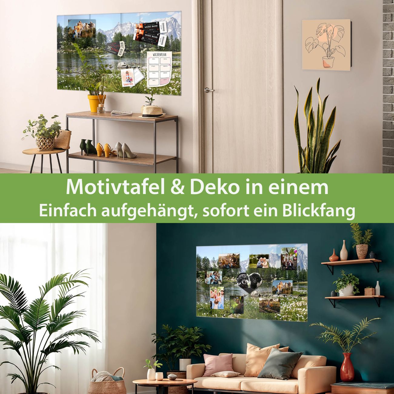Material: 4mm Sicherheitsglas mit Metallrückwand Eigenschaften: beschreibbar, magnetisch, kratzfest Maße: 90x60x0,6cm, 8,10kg schwer Motiv Nummer 12296 Bergidylle Zubehör: inklusive 4 Neodym-Magnete