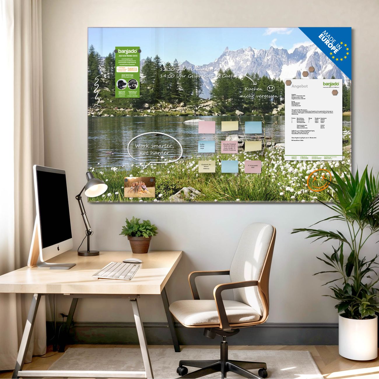 Die banjado Glas Magnettafel mit dem Motiv Motiv Bergidylle verbindet Funktionalität mit Stil. Sie ersetzt das Zettelchaos durch klare Strukturen und bringt dabei eine warme, natürliche Atmosphäre in Ihr Zuhause. Ob im Büro, in der Küche oder im Eingangsbereich - dieses Design-Board zieht Blicke an und sorgt für Ordnung mit Charakter.