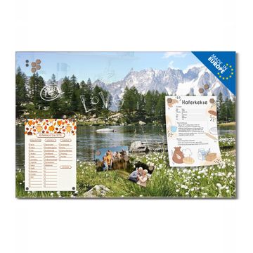 Material: 4mm Sicherheitsglas mit Metallrückwand Eigenschaften: beschreibbar, magnetisch, kratzfest Maße: 45x30x0,6cm, 2,03kg schwer Motiv Nummer 12296 Bergidylle Zubehör: inklusive 4 Neodym-Magnete