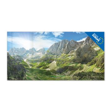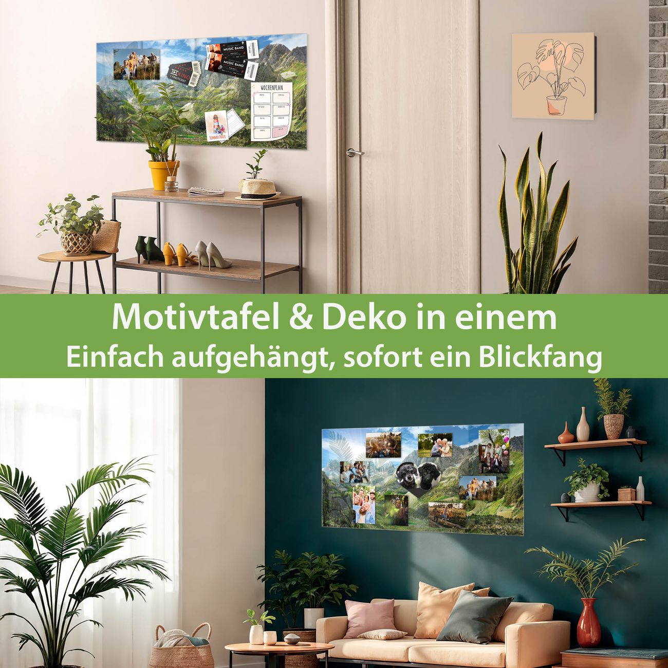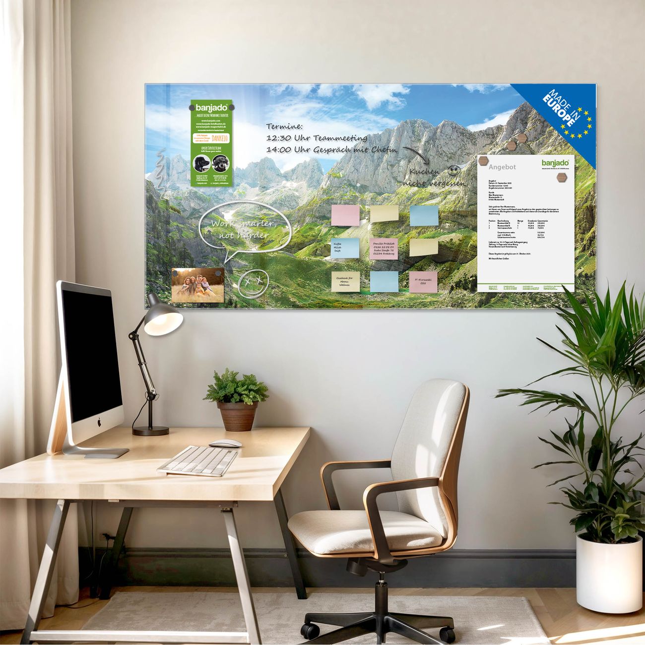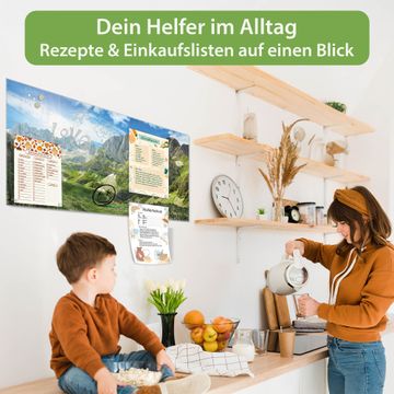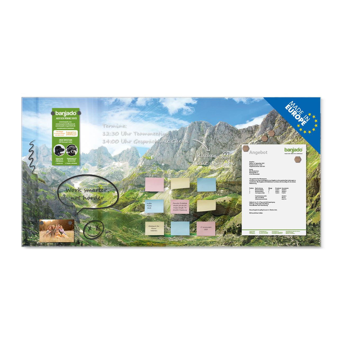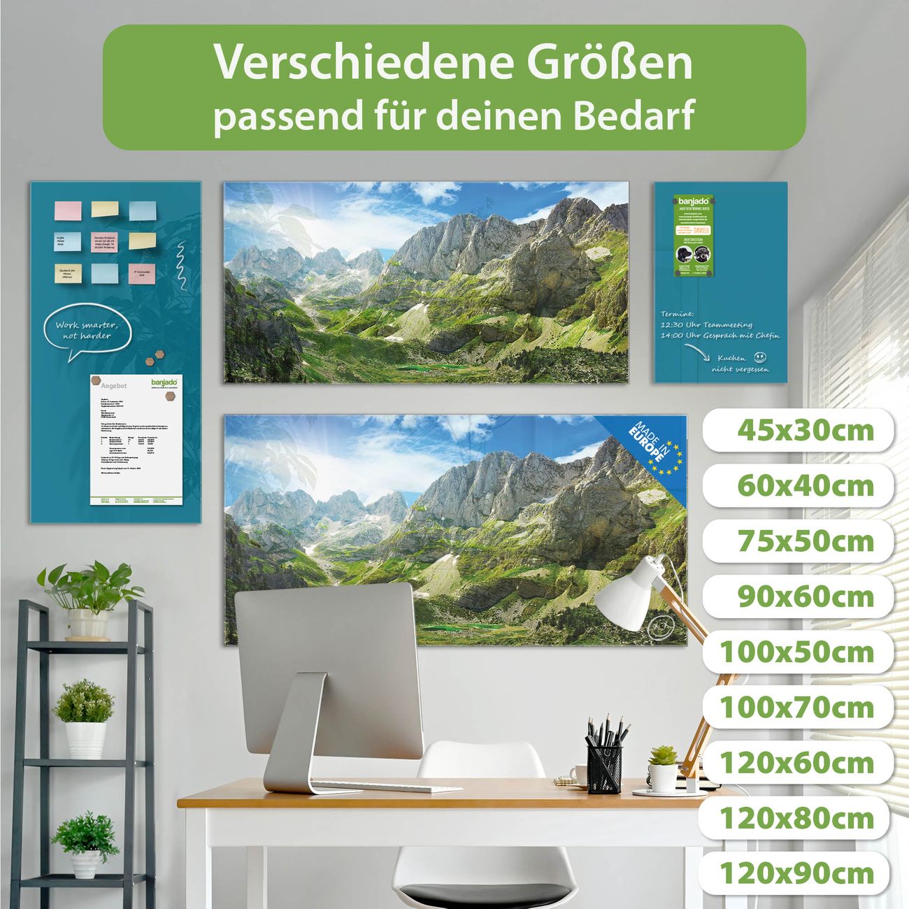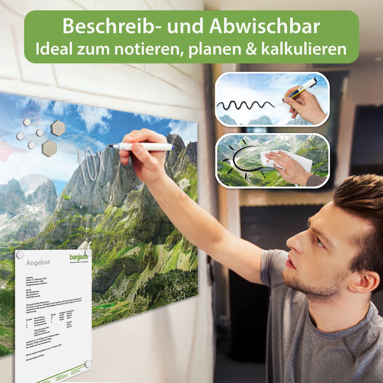 Material: 4mm Sicherheitsglas mit Metallrückwand Eigenschaften: beschreibbar, magnetisch, kratzfest Maße: 110x55x0,6cm, 9,08kg schwer Motiv Nummer 12754 Bergsee Alpen Zubehör: inklusive 4 Neodym-Magnete
