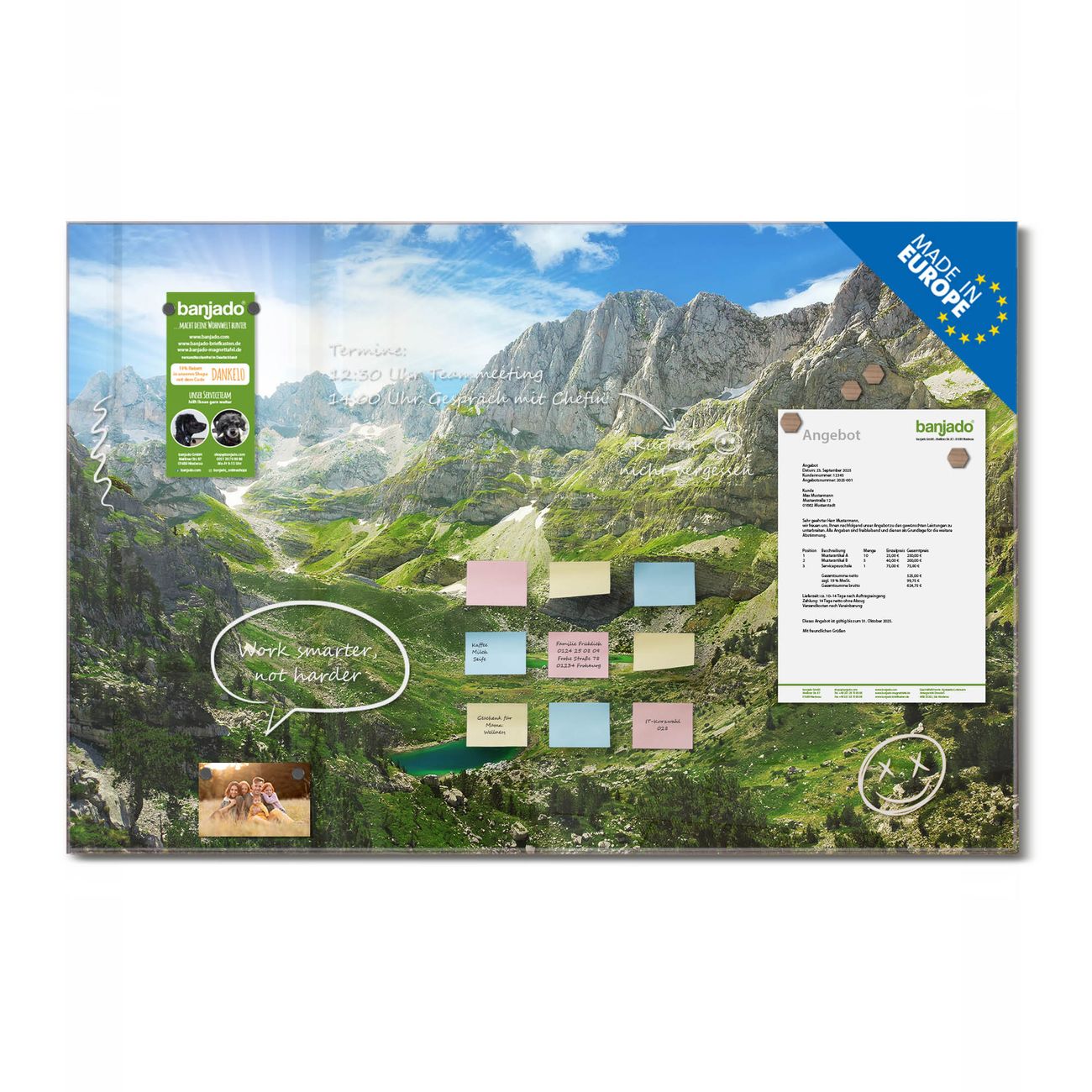 Material: 4mm Sicherheitsglas mit Metallrückwand Eigenschaften: beschreibbar, magnetisch, kratzfest Maße: 120x80x0,6cm, 14,40kg schwer Motiv Nummer 12754 Bergsee Alpen Zubehör: inklusive 4 Neodym-Magnete