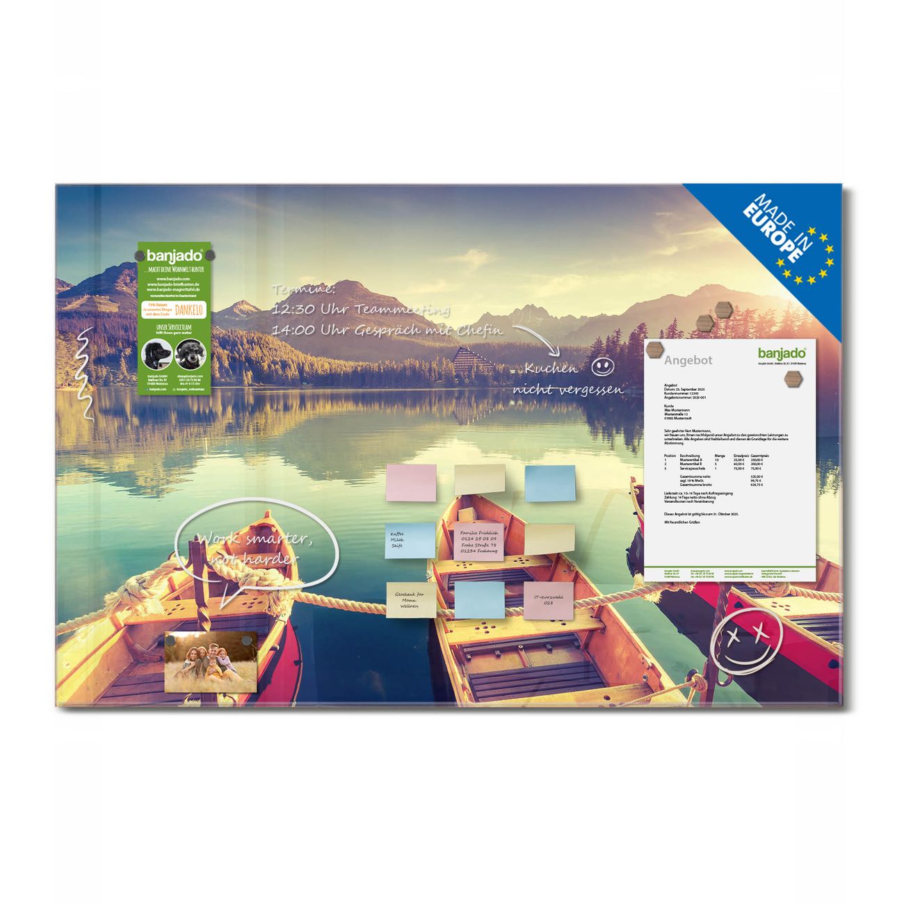 Material: 4mm Sicherheitsglas mit Metallrückwand Eigenschaften: beschreibbar, magnetisch, kratzfest Maße: 120x80x0,6cm, 14,40kg schwer Motiv Nummer 10965 Drei Boote Am Steg Zubehör: inklusive 4 Neodym-Magnete