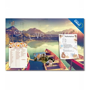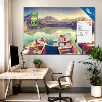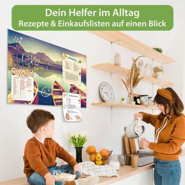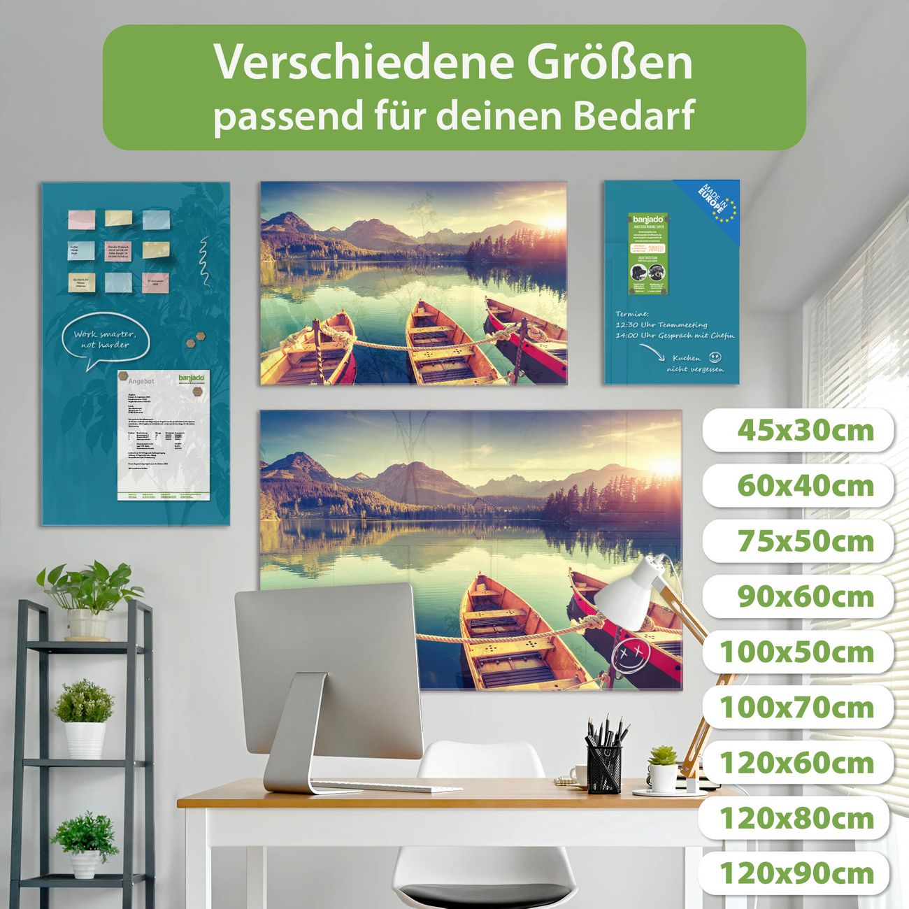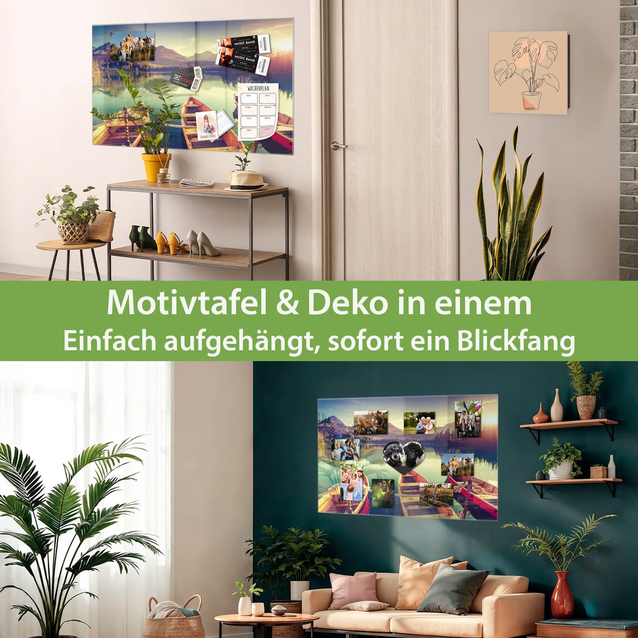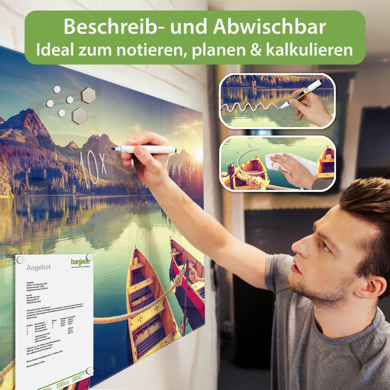 Material: 4mm Sicherheitsglas mit Metallrückwand Eigenschaften: beschreibbar, magnetisch, kratzfest Maße: 75x50x0,6cm, 5,63kg schwer Motiv Nummer 10965 Drei Boote Am Steg Zubehör: inklusive 4 Neodym-Magnete