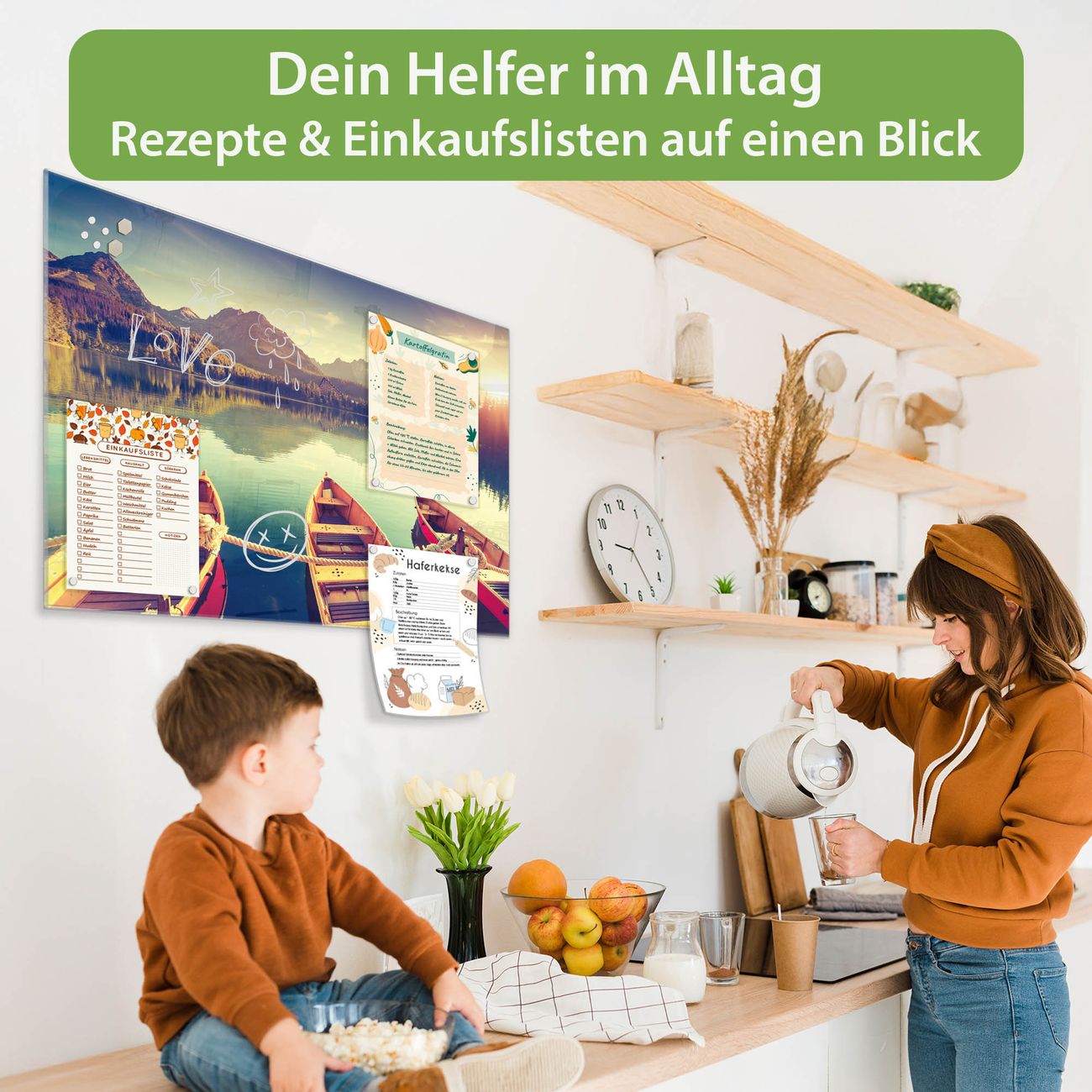 Auf der glatten Glasoberfläche lassen sich Termine, Rezepte oder Notizen ganz einfach mit Kreidestiften festhalten und rückstandslos entfernen. Starke Neodym-Magnete halten Ihre wichtigsten Erinnerungen sicher an Ort und Stelle. So entsteht Ihre ganz persönliche Ideenwand - jeden Tag neu.