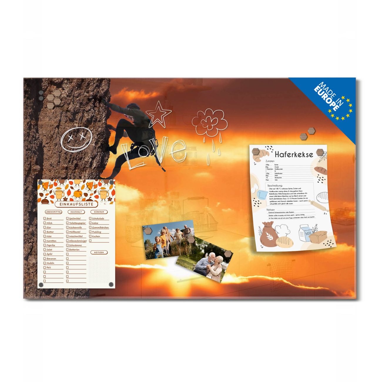 Material: 4mm Sicherheitsglas mit Metallrückwand Eigenschaften: beschreibbar, magnetisch, kratzfest Maße: 75x50x0,6cm, 5,63kg schwer Motiv Nummer 10117 Bergsteiger Zubehör: inklusive 4 Neodym-Magnete
