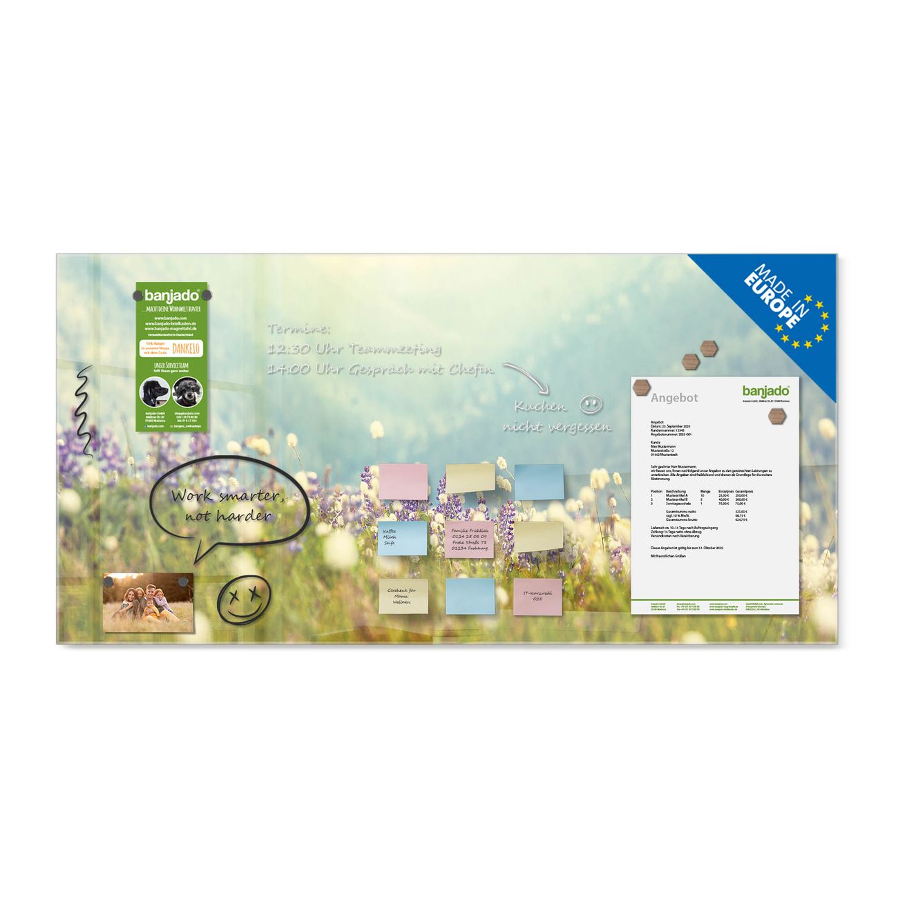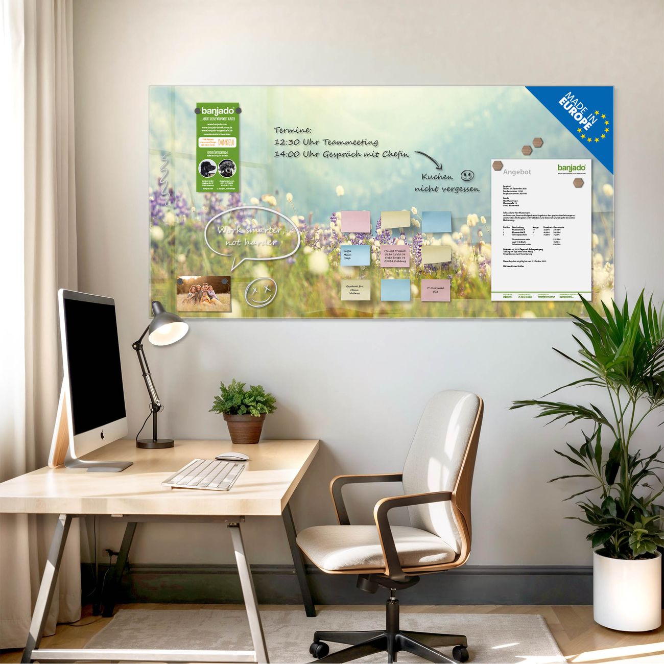 Jede Glas Magnettafel wird in unserer Werkstatt von Hand gefertigt und sorgfältig geprüft. So erhalten Sie ein echtes Qualitätsprodukt, das Funktion und Ästhetik perfekt vereint.?? Warum banjado?