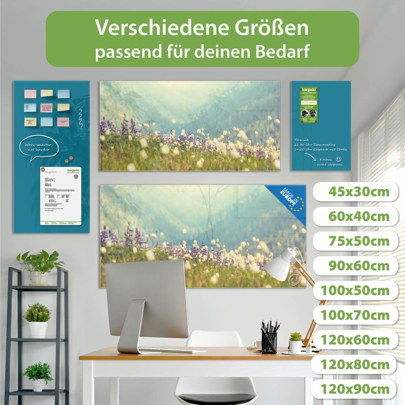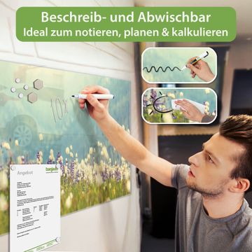 Material: 4mm Sicherheitsglas mit Metallrückwand Eigenschaften: beschreibbar, magnetisch, kratzfest Maße: 100x50x0,6cm, 7,50kg schwer Motiv Nummer 12025 Bergwiese Zubehör: inklusive 4 Neodym-Magnete