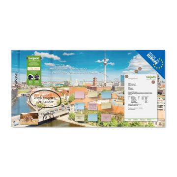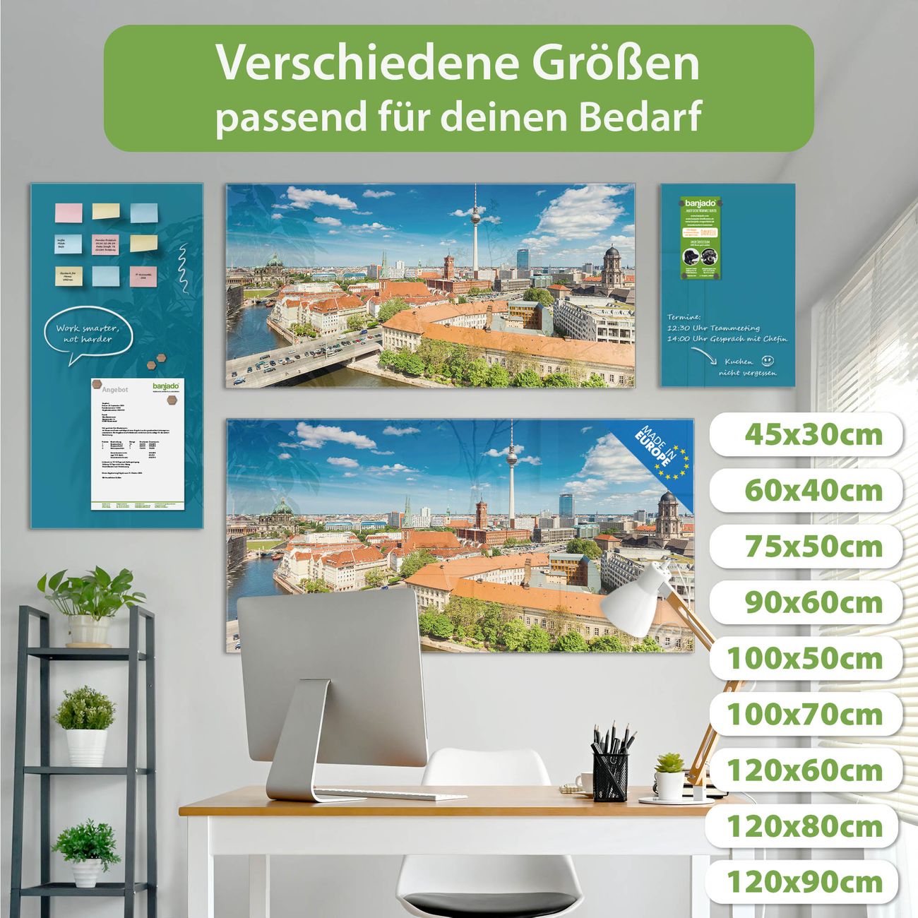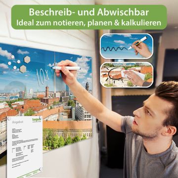 Material: 4mm Sicherheitsglas mit Metallrückwand Eigenschaften: beschreibbar, magnetisch, kratzfest Maße: 100x50x0,6cm, 7,50kg schwer Motiv Nummer 12407 Berlin Mitte Zubehör: inklusive 4 Neodym-Magnete