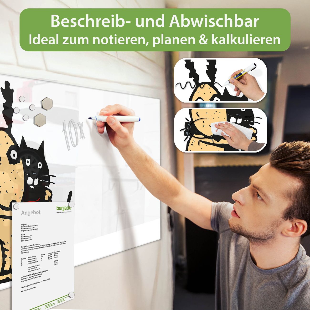 Bitte beachten Sie, dass ausschliessliche spezielle Magnete an der Glastafel haften. Wir empfehlen banjado Neodym Magnete, diese sind durch uns auf Wirksamkeit geprüft.