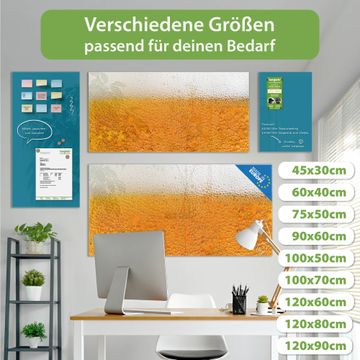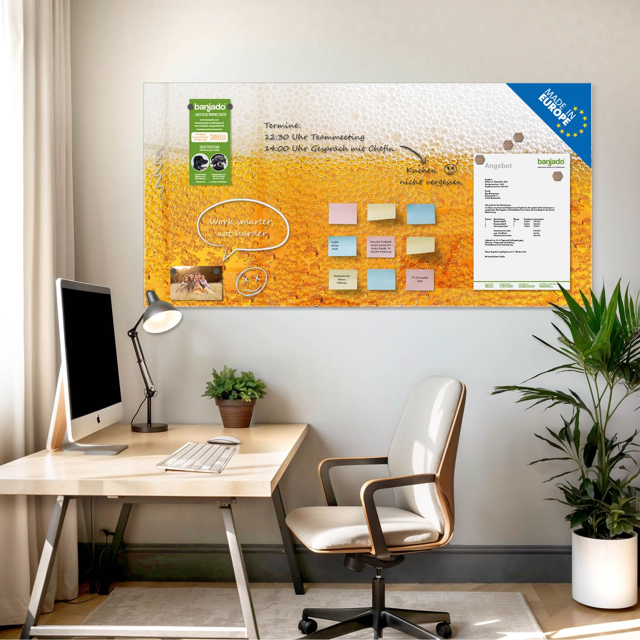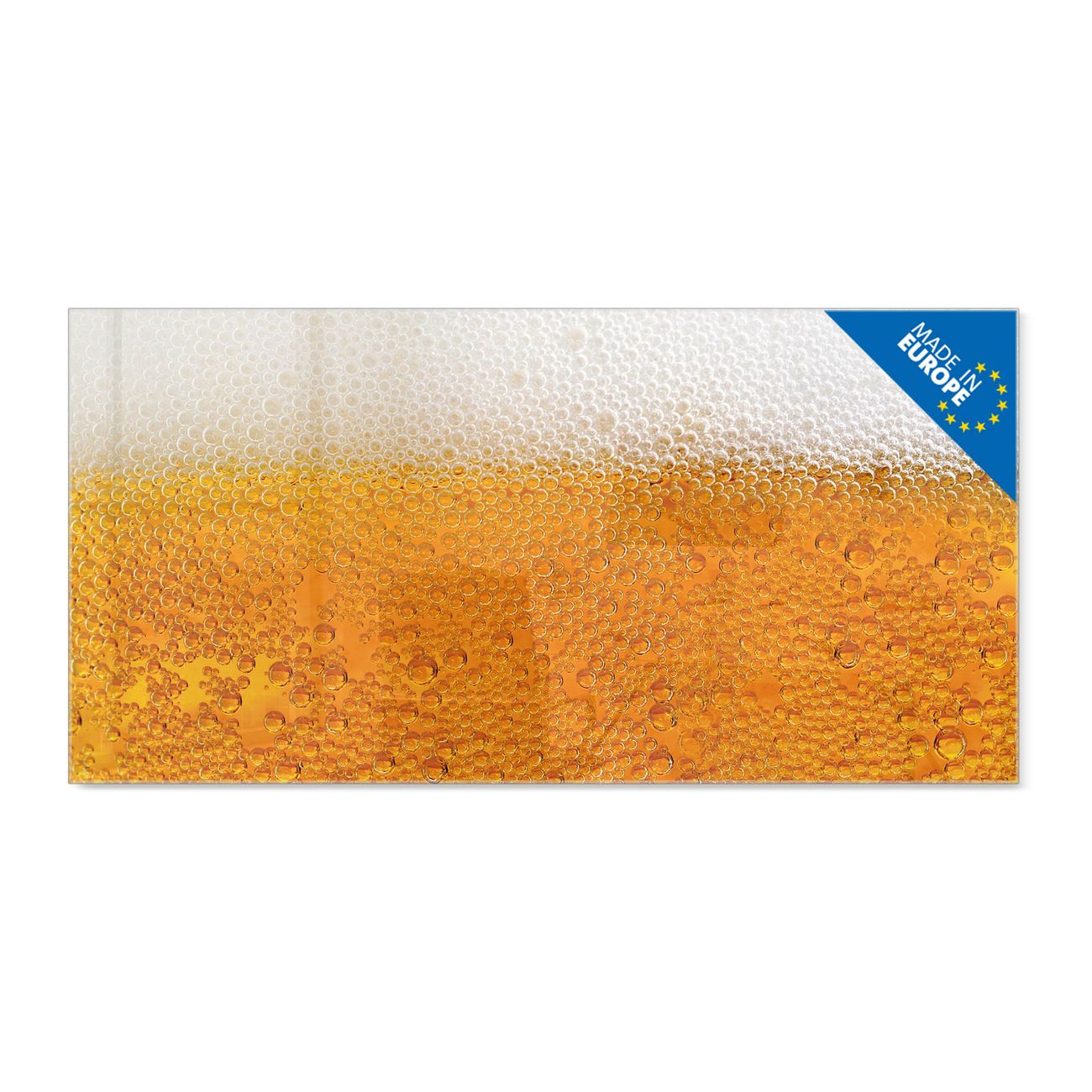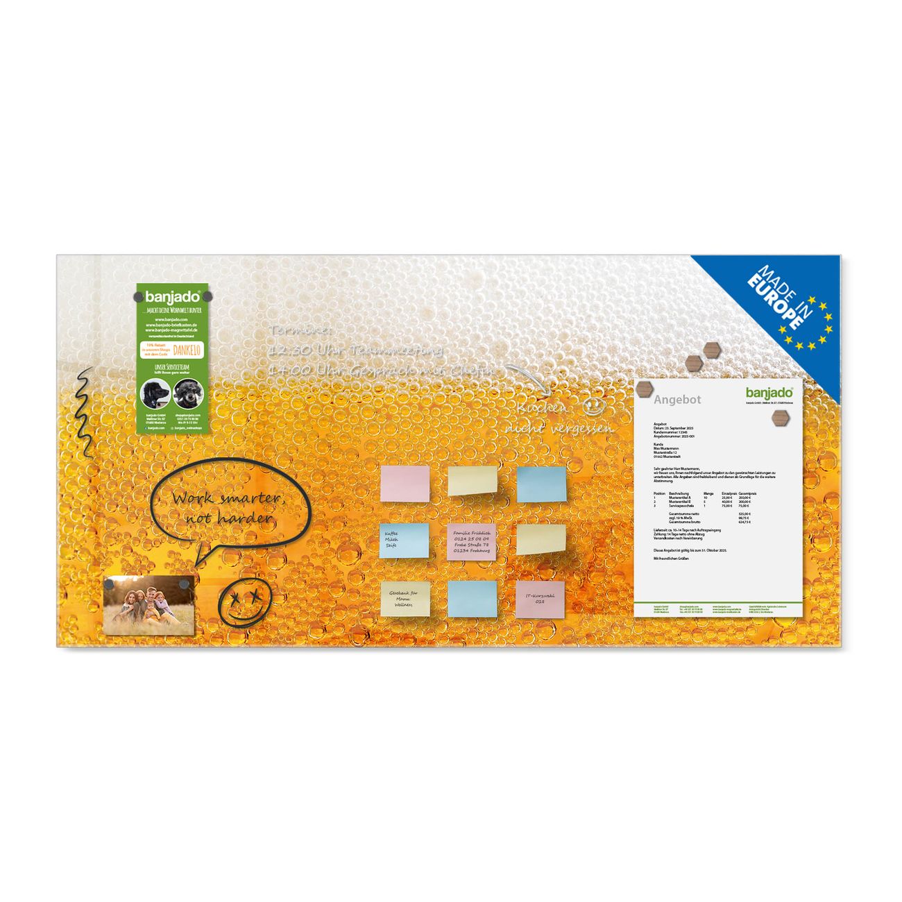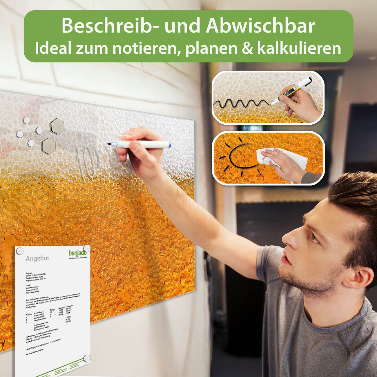 Material: 4mm Sicherheitsglas mit Metallrückwand Eigenschaften: beschreibbar, magnetisch, kratzfest Maße: 100x50x0,6cm, 7,50kg schwer Motiv Nummer 10145 Bier Zubehör: inklusive 4 Neodym-Magnete