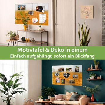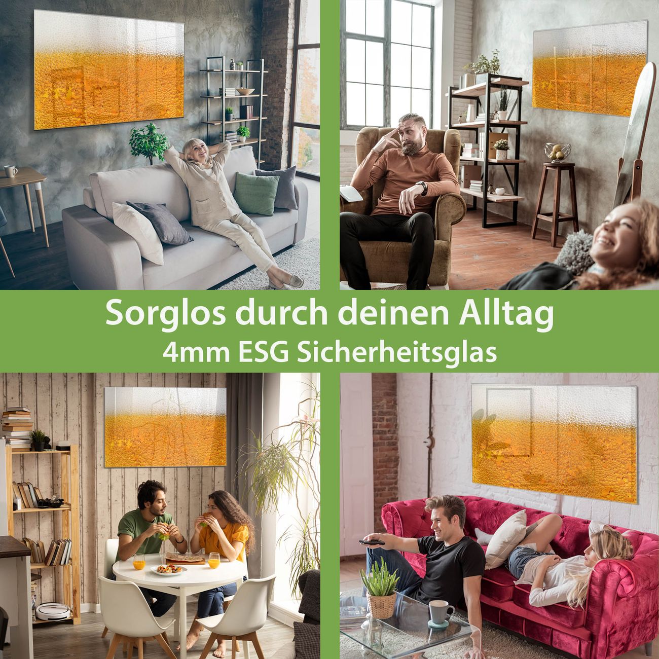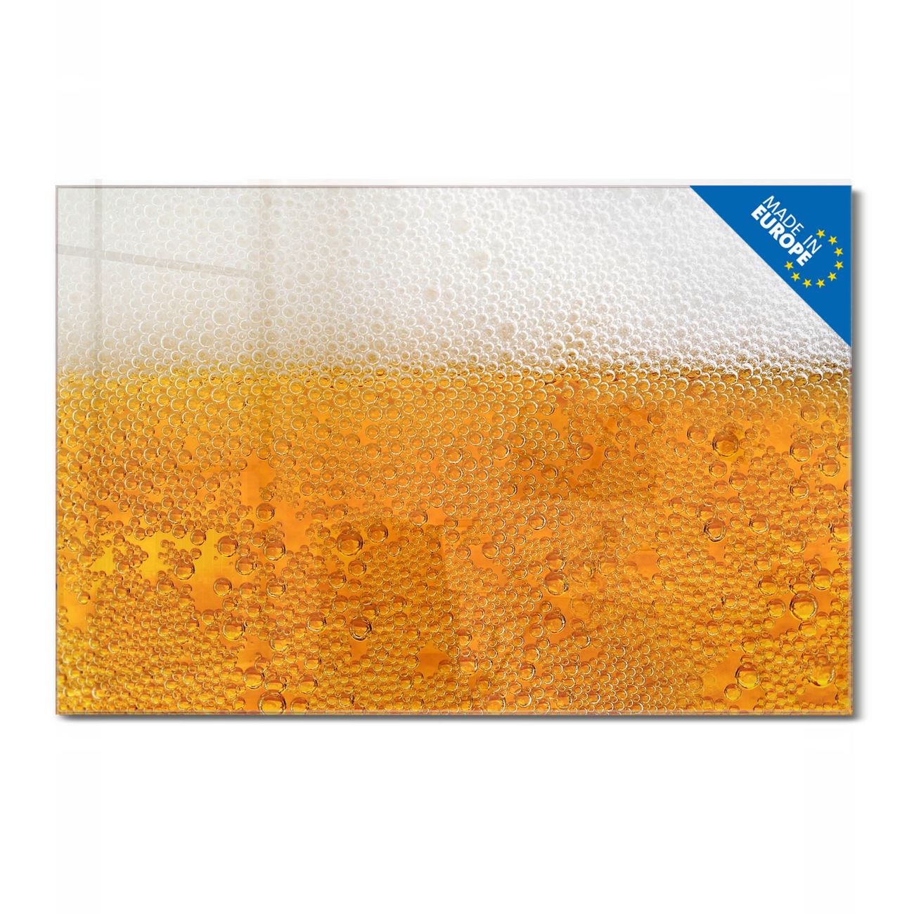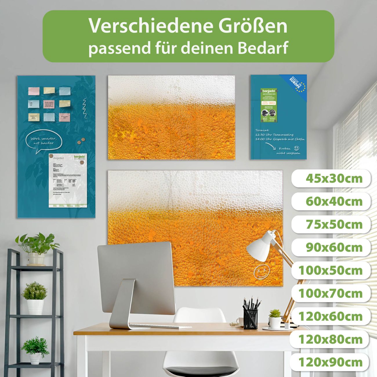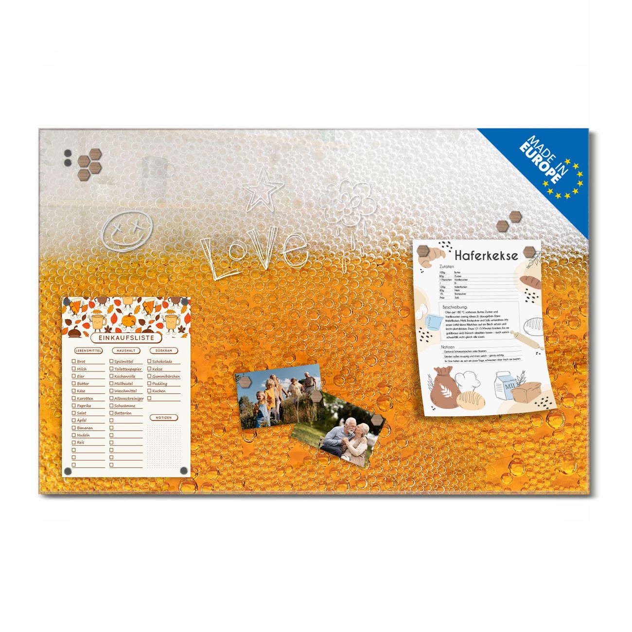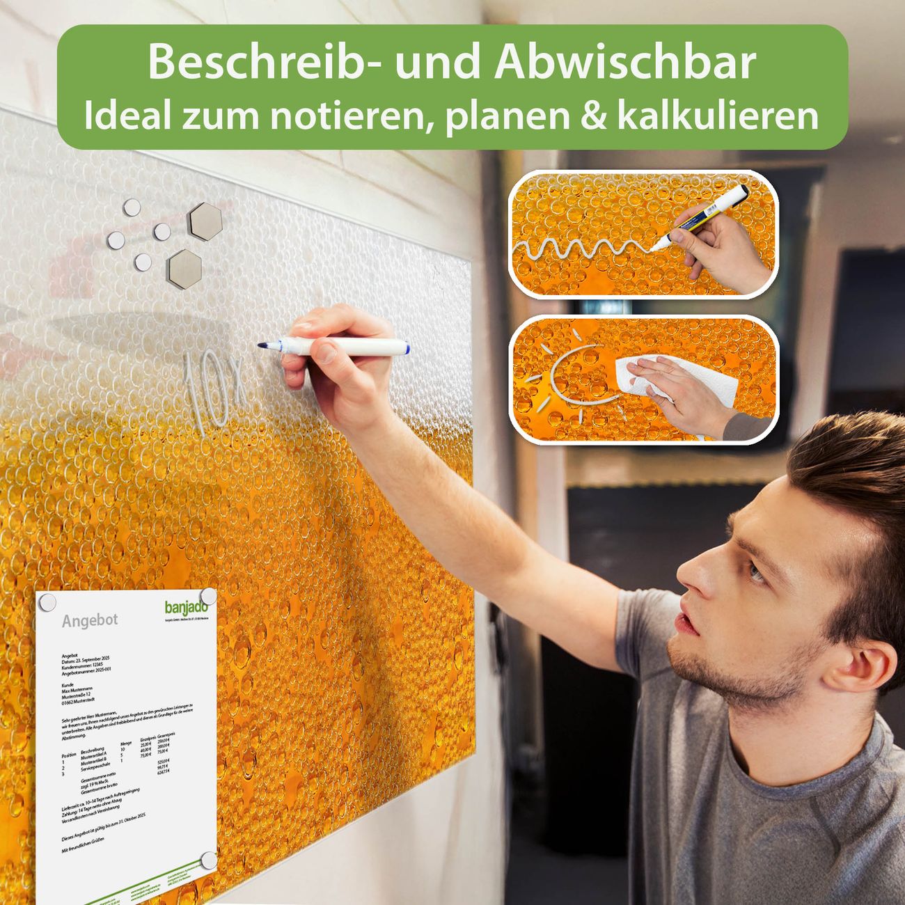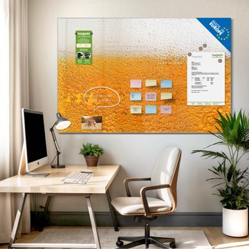 Material: 4mm Sicherheitsglas mit Metallrückwand Eigenschaften: beschreibbar, magnetisch, kratzfest Maße: 75x50x0,6cm, 5,63kg schwer Motiv Nummer 10145 Bier Zubehör: inklusive 4 Neodym-Magnete