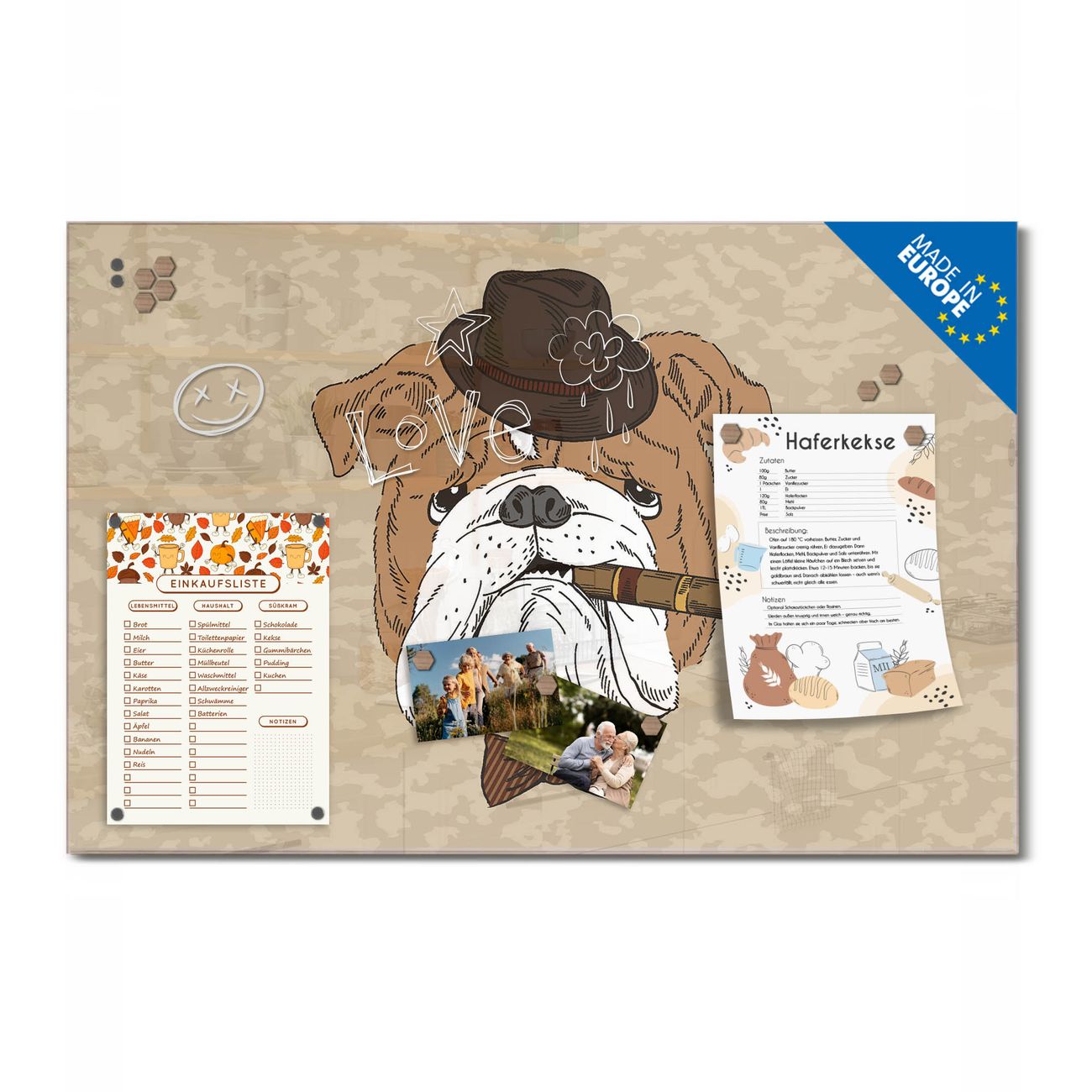 Ein Stück Design, das Ihren Alltag organisiert. Schreiben, heften, inspirieren - alles an einem Ort. Qualität, die man spürt. Montage leicht gemacht. Handwerk mit Herz - veredelt in Sachsen. Einzigartiges Design mit Motiv Motiv Big Daddy Beschreibbare Glasoberfläche, leicht zu reinigen Starke Magnetkraft durch Stahlrückwand Inklusive 4 Neodym-Magneten Flexible Montageoptionen Handveredelt in Sachsen - Qualität, die bleibt