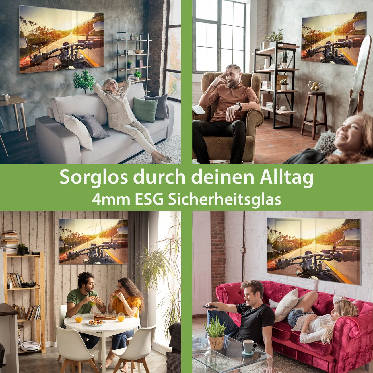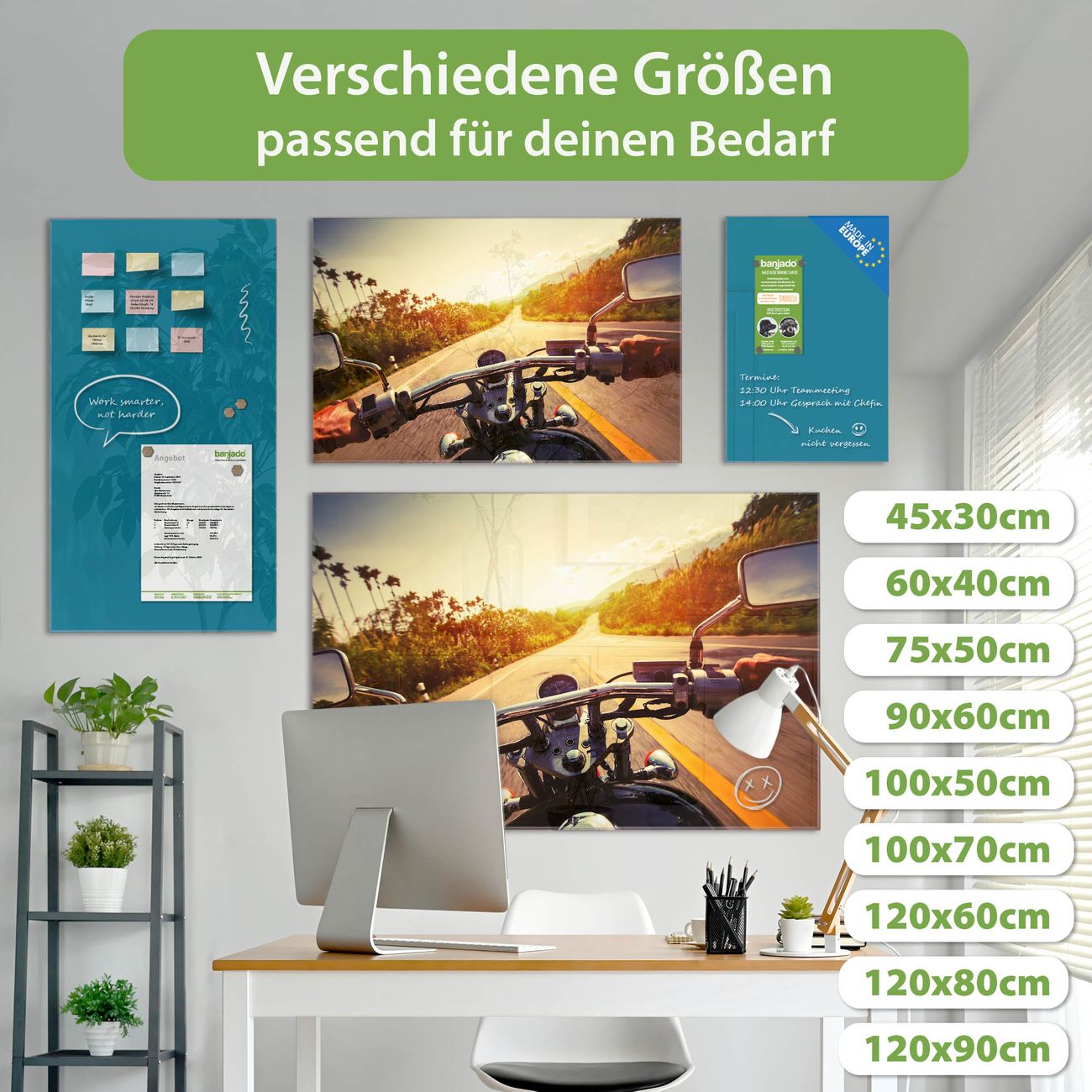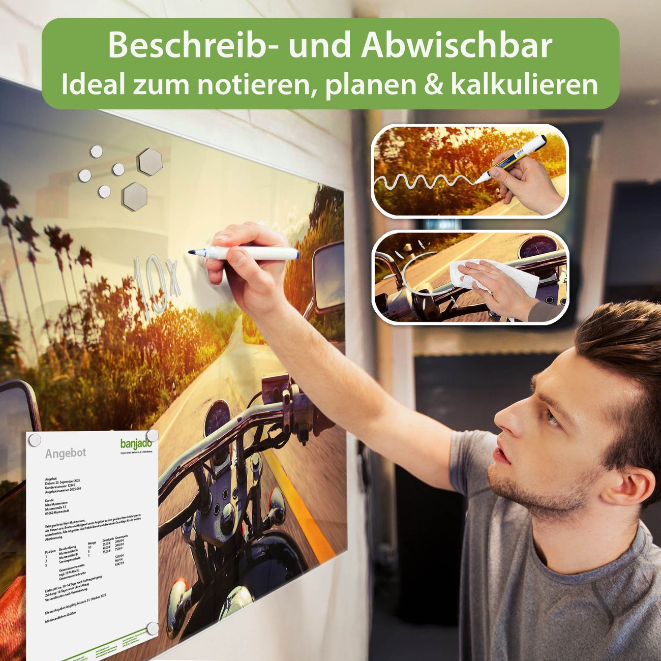 Material: 4mm Sicherheitsglas mit Metallrückwand Eigenschaften: beschreibbar, magnetisch, kratzfest Maße: 90x60x0,6cm, 8,10kg schwer Motiv Nummer 12695 Easy Rider Zubehör: inklusive 4 Neodym-Magnete