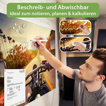 Die banjado Glas Magnettafel mit dem Motiv Motiv Easy Rider verbindet Funktionalität mit Stil. Sie ersetzt das Zettelchaos durch klare Strukturen und bringt dabei eine warme, natürliche Atmosphäre in Ihr Zuhause. Ob im Büro, in der Küche oder im Eingangsbereich - dieses Design-Board zieht Blicke an und sorgt für Ordnung mit Charakter.