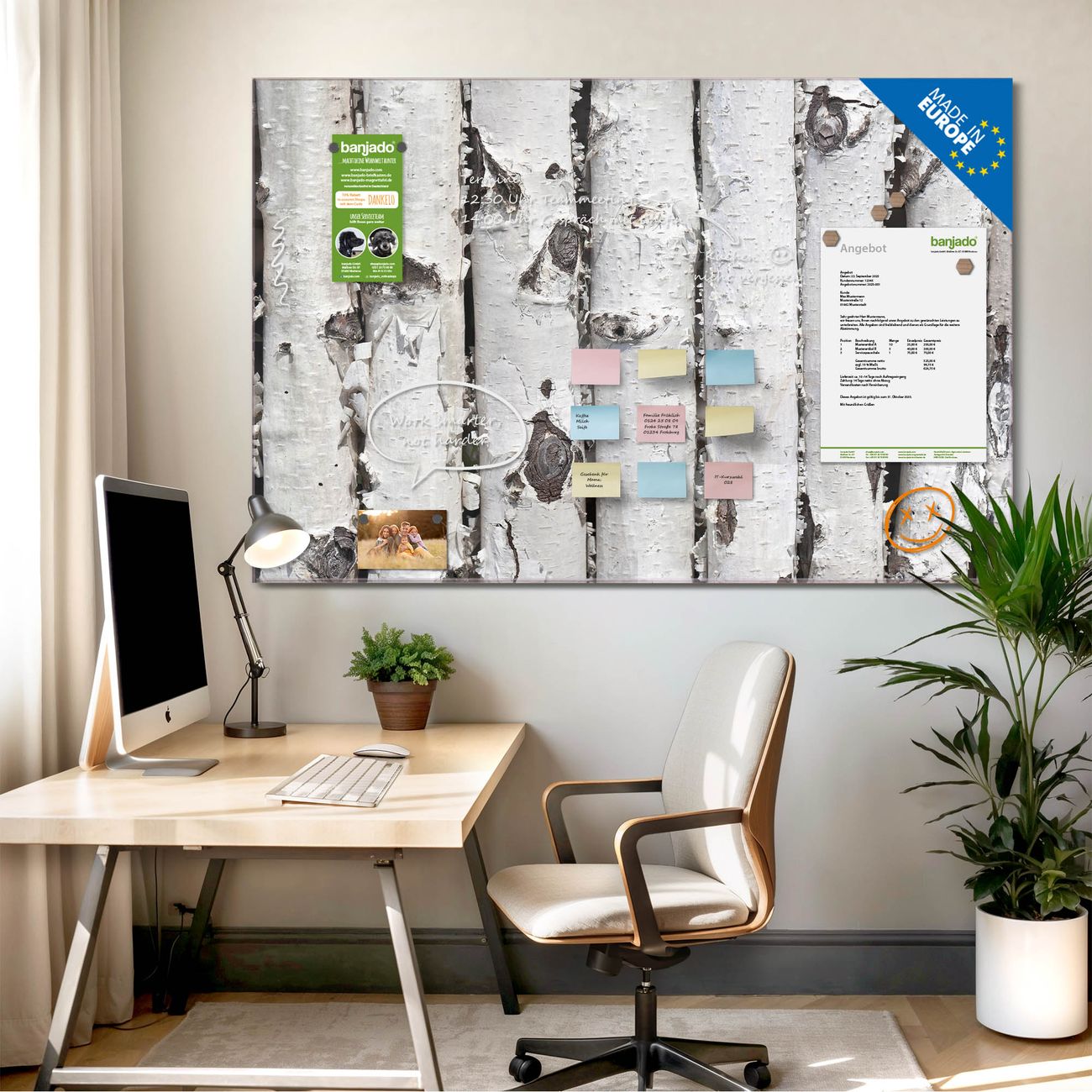 Die banjado Glas Magnettafel mit dem Motiv Motiv Birkenrinde verbindet Funktionalität mit Stil. Sie ersetzt das Zettelchaos durch klare Strukturen und bringt dabei eine warme, natürliche Atmosphäre in Ihr Zuhause. Ob im Büro, in der Küche oder im Eingangsbereich - dieses Design-Board zieht Blicke an und sorgt für Ordnung mit Charakter.