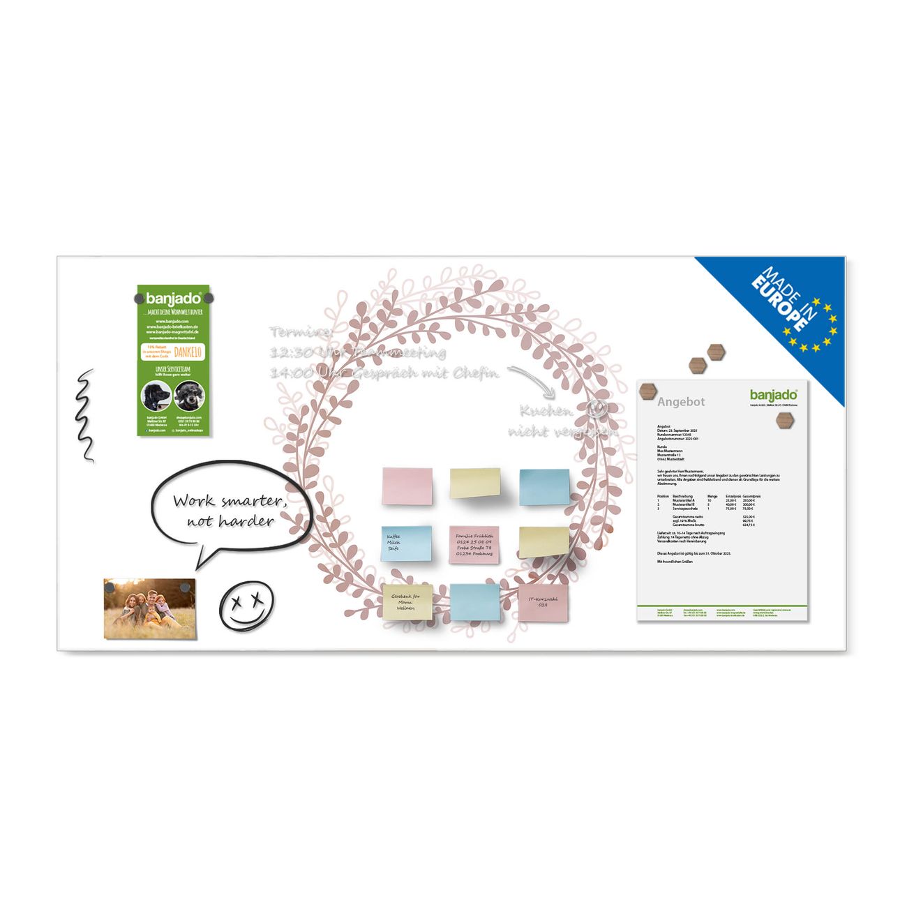 Material: 4mm Sicherheitsglas mit Metallrückwand Eigenschaften: beschreibbar, magnetisch, kratzfest Maße: 120x60x0,6cm, 10,80kg schwer Motiv Nummer 10380 Blätterkranz Zubehör: inklusive 4 Neodym-Magnete