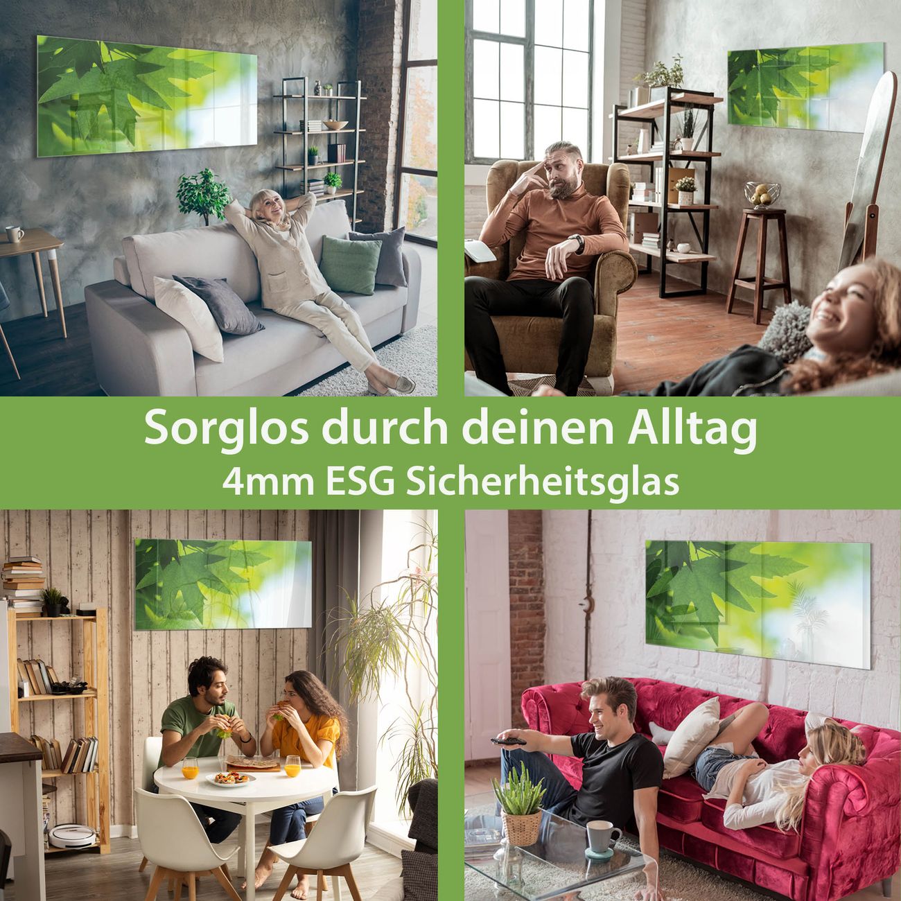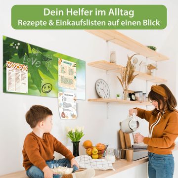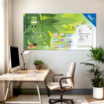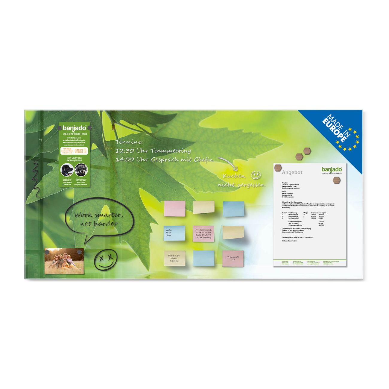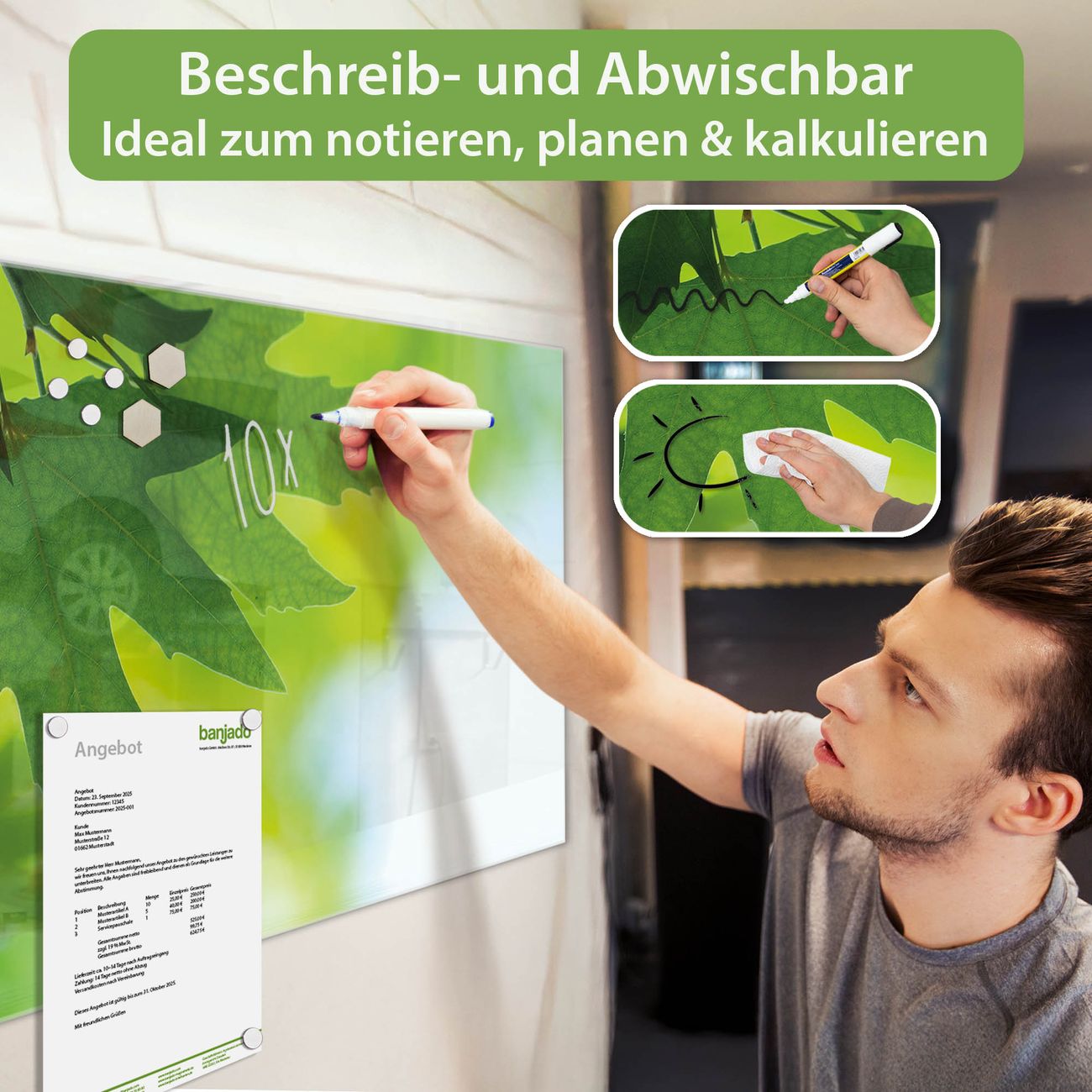 Material: 4mm Sicherheitsglas mit Metallrückwand Eigenschaften: beschreibbar, magnetisch, kratzfest Maße: 100x50x0,6cm, 7,50kg schwer Motiv Nummer 10106 Blättertraum Zubehör: inklusive 4 Neodym-Magnete