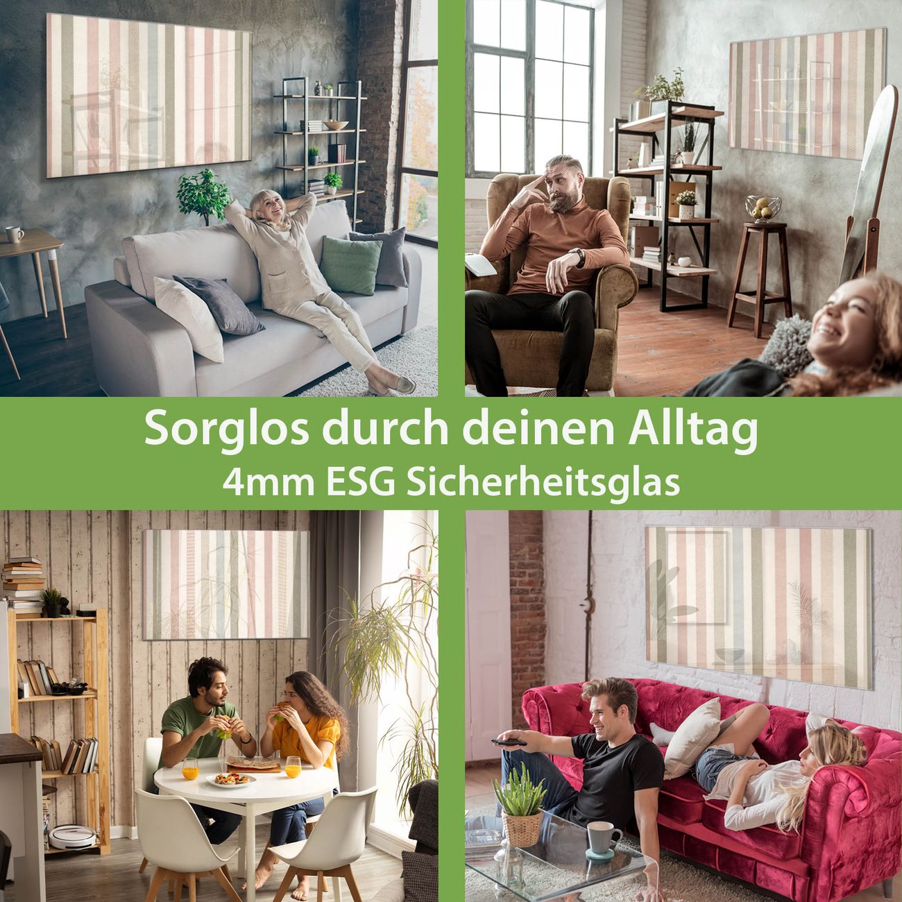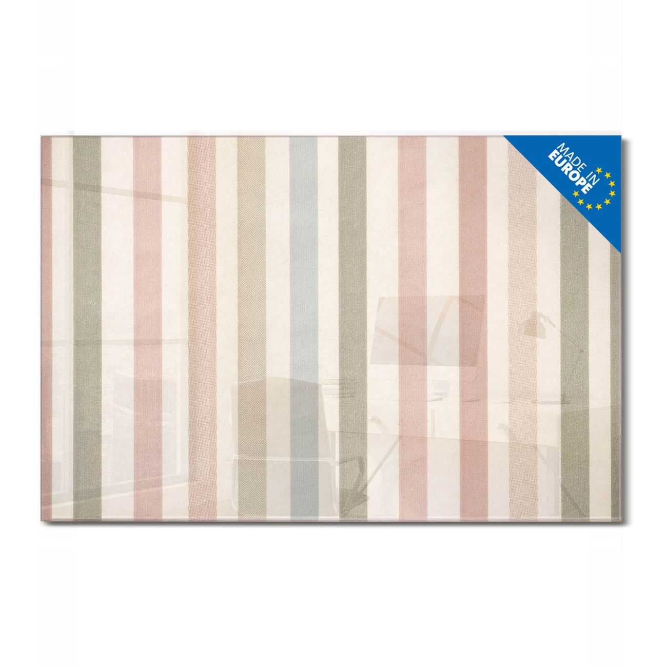 Material: 4mm Sicherheitsglas mit Metallrückwand Eigenschaften: beschreibbar, magnetisch, kratzfest Maße: 120x80x0,6cm, 14,40kg schwer Motiv Nummer 12139 Blasse Streifen Zubehör: inklusive 4 Neodym-Magnete
