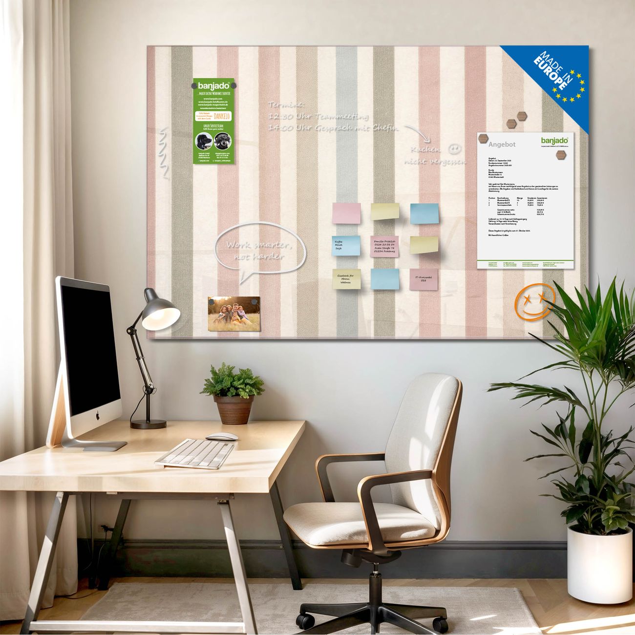 Die banjado Glas Magnettafel mit dem Motiv Motiv Blasse Streifen verbindet Funktionalität mit Stil. Sie ersetzt das Zettelchaos durch klare Strukturen und bringt dabei eine warme, natürliche Atmosphäre in Ihr Zuhause. Ob im Büro, in der Küche oder im Eingangsbereich - dieses Design-Board zieht Blicke an und sorgt für Ordnung mit Charakter.
