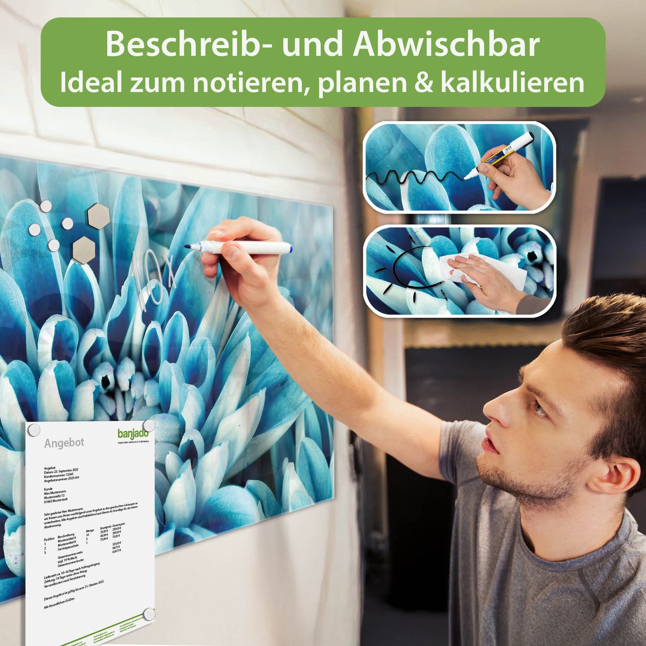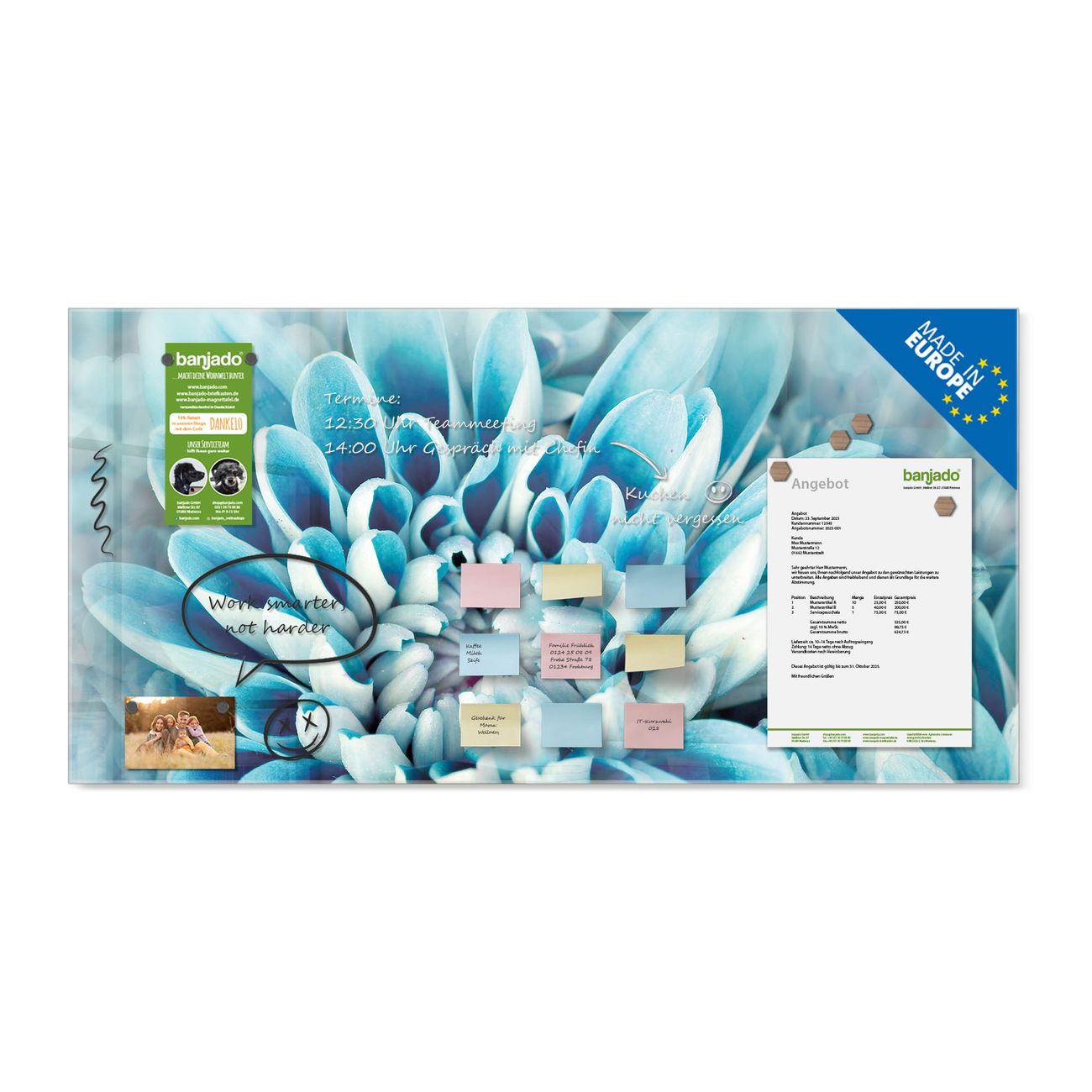 Material: 4mm Sicherheitsglas mit Metallrückwand Eigenschaften: beschreibbar, magnetisch, kratzfest Maße: 100x50x0,6cm, 7,50kg schwer Motiv Nummer 11444 Blaue Blüten Zubehör: inklusive 4 Neodym-Magnete