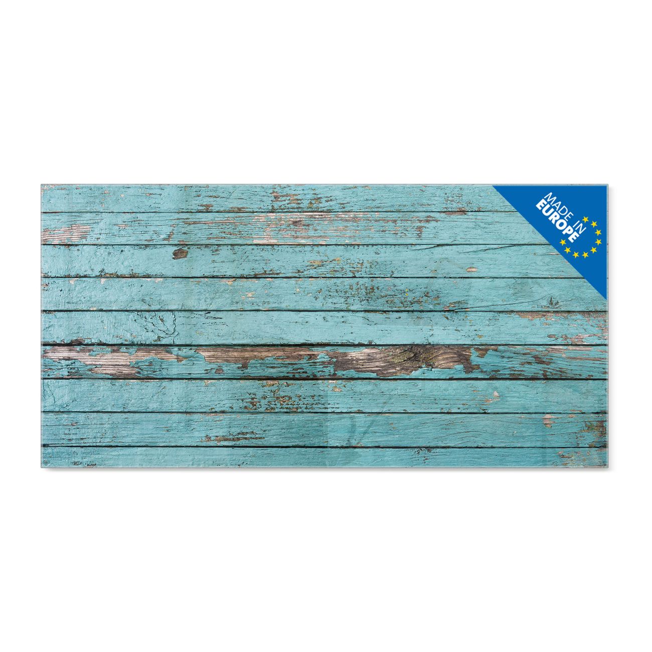Material: 4mm Sicherheitsglas mit Metallrückwand Eigenschaften: beschreibbar, magnetisch, kratzfest Maße: 120x60x0,6cm, 10,80kg schwer Motiv Nummer 10627 Blaue Holzlatten Zubehör: inklusive 4 Neodym-Magnete