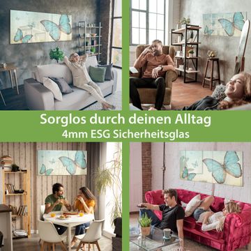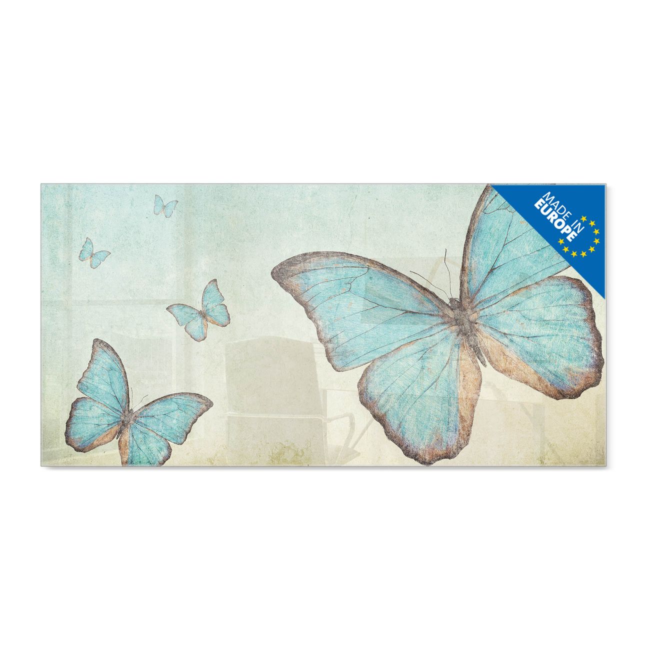 Material: 4mm Sicherheitsglas mit Metallrückwand Eigenschaften: beschreibbar, magnetisch, kratzfest Maße: 100x50x0,6cm, 7,50kg schwer Motiv Nummer 10657 Blaue Schmetterlinge Zubehör: inklusive 4 Neodym-Magnete