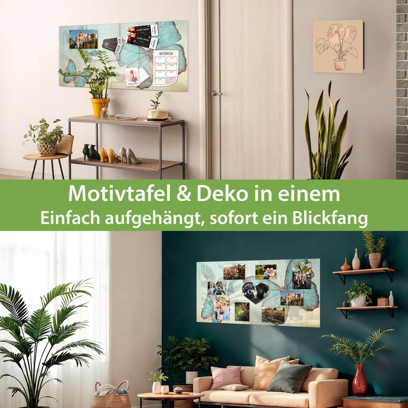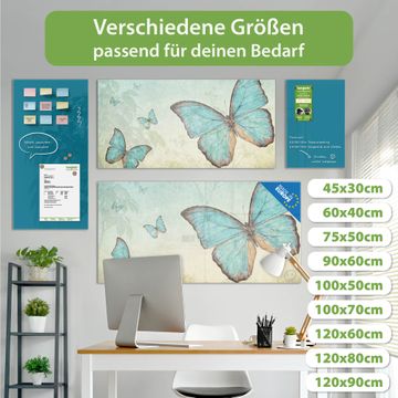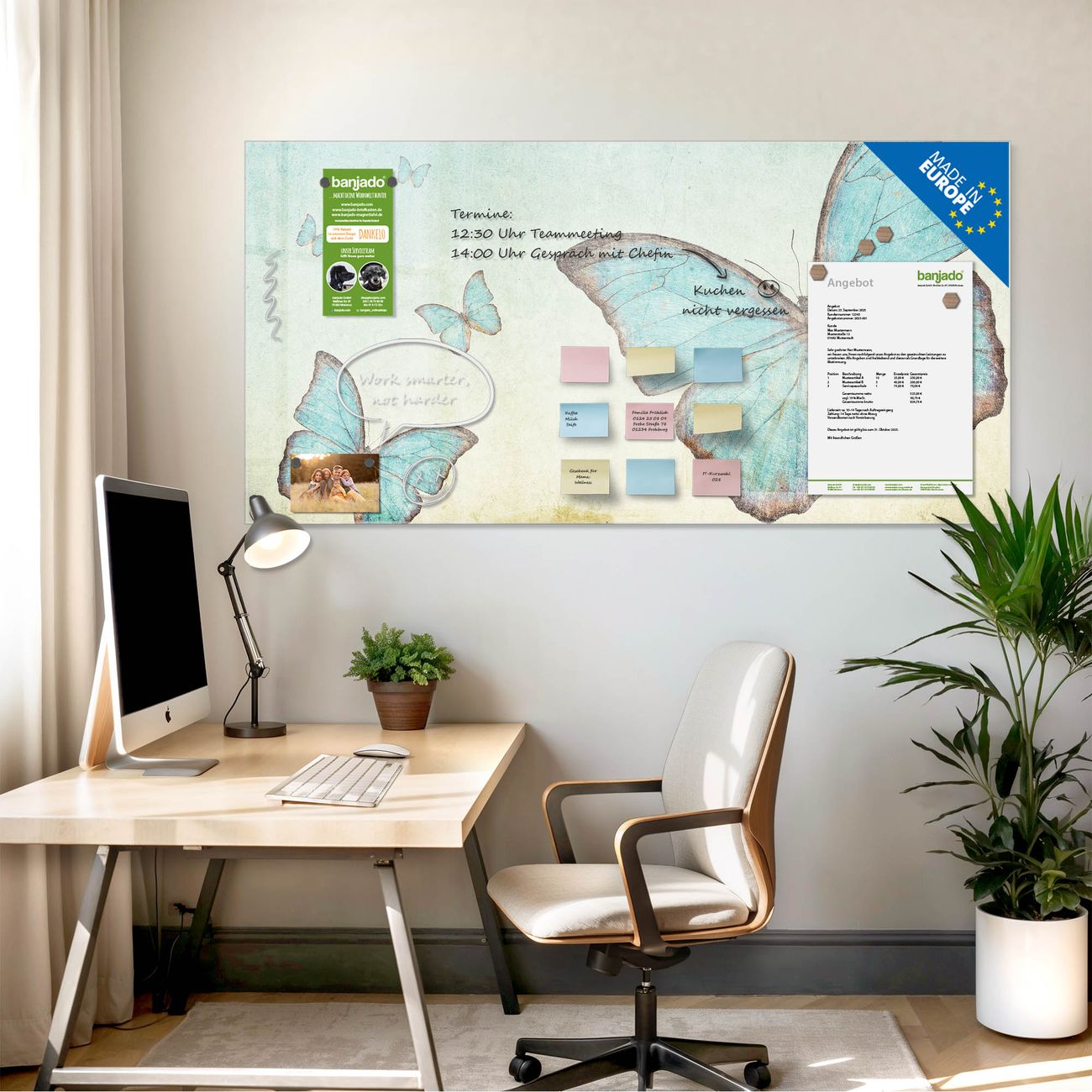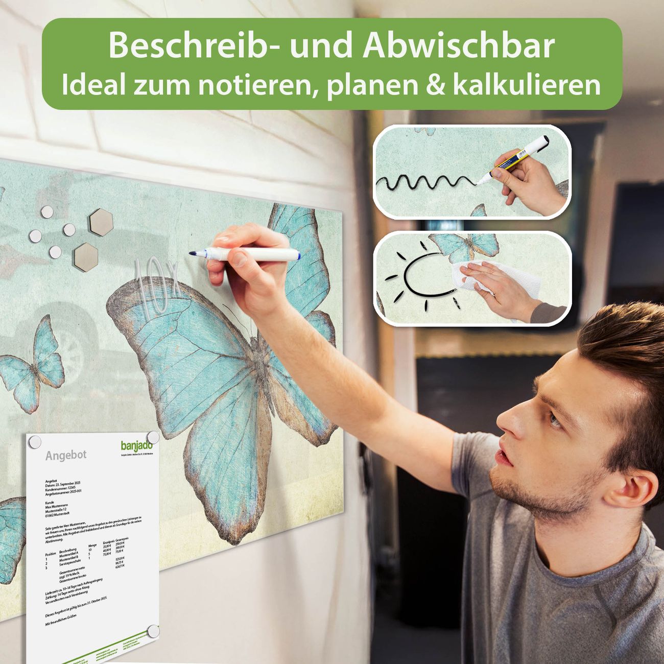 Die banjado Glas Magnettafel mit dem Motiv Motiv Blaue Schmetterlinge verbindet Funktionalität mit Stil. Sie ersetzt das Zettelchaos durch klare Strukturen und bringt dabei eine warme, natürliche Atmosphäre in Ihr Zuhause. Ob im Büro, in der Küche oder im Eingangsbereich - dieses Design-Board zieht Blicke an und sorgt für Ordnung mit Charakter.